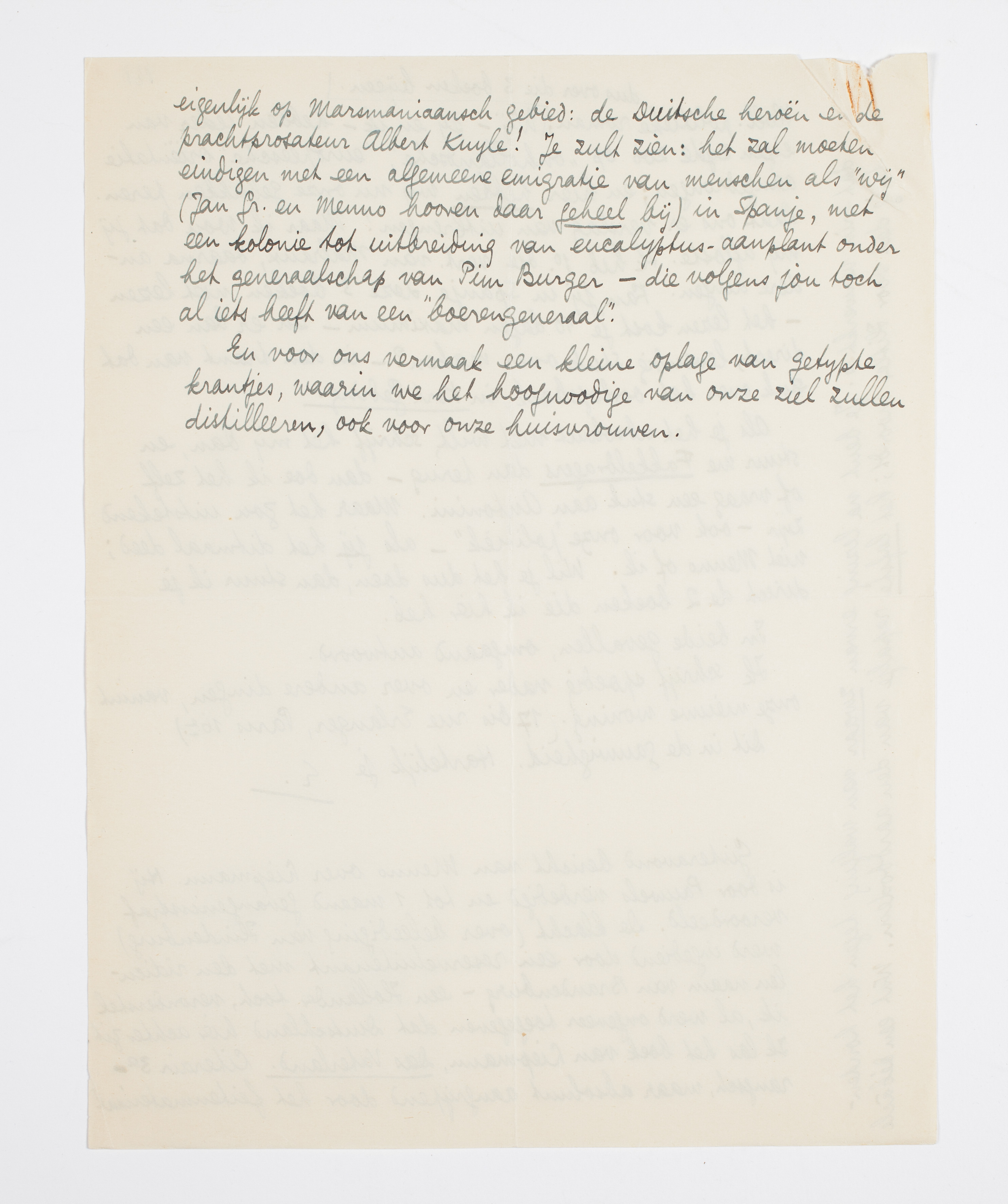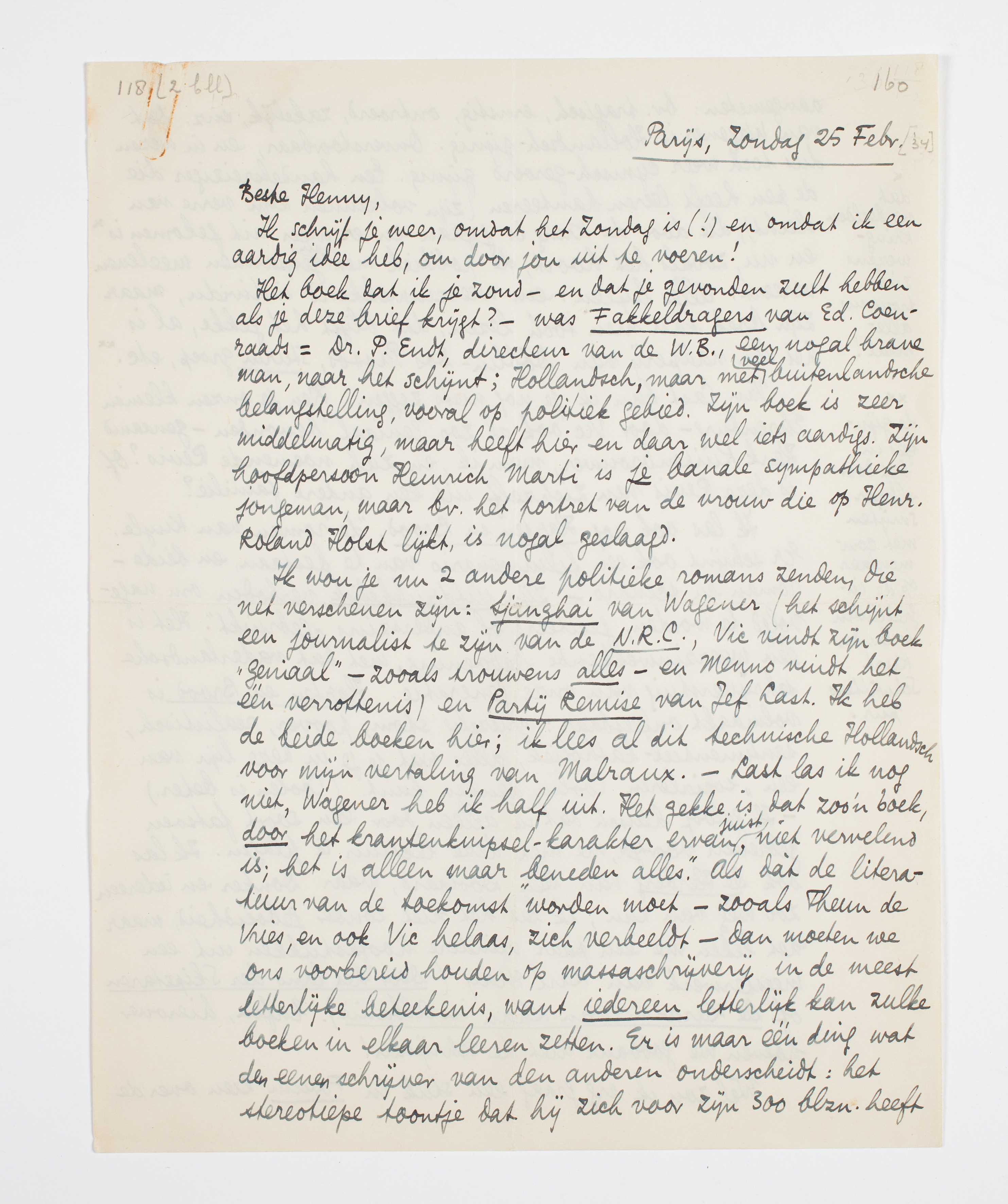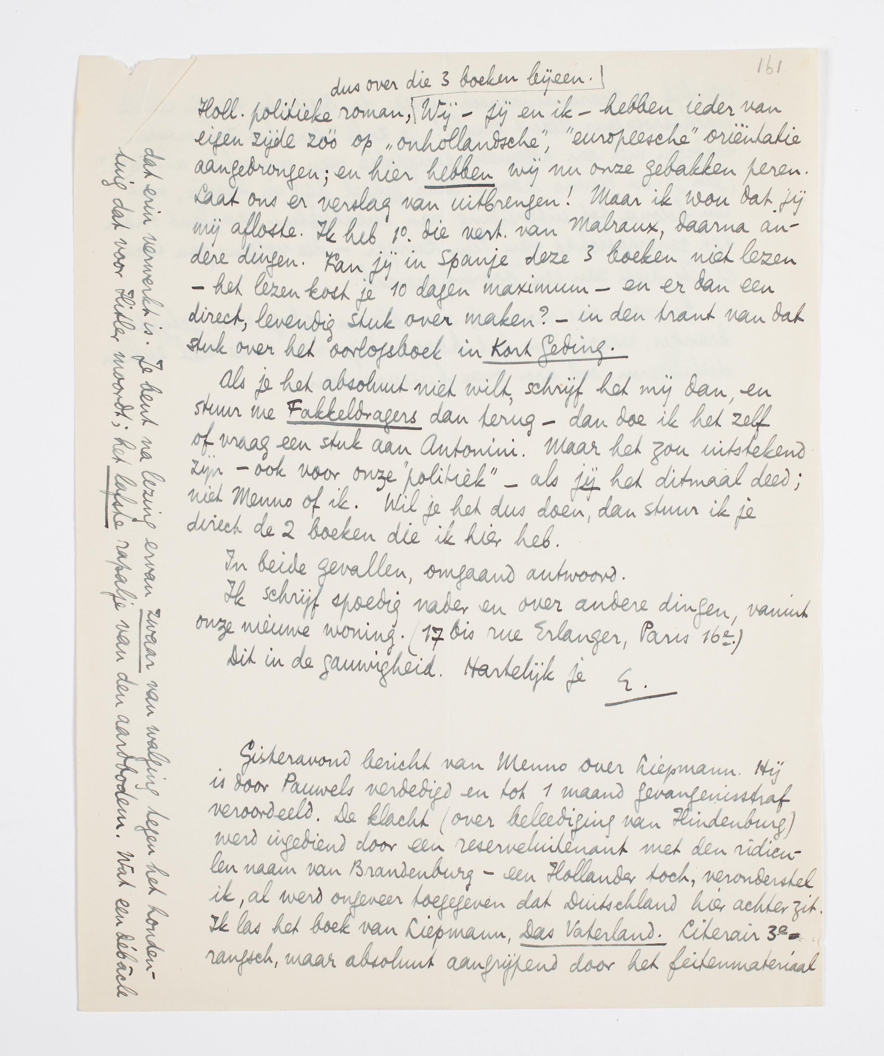 Wel zou ik erg graag een stuk in Forum zien over de Holl. politieke roman, dus over die 3 boeken bijeen. Wij - jij en ik - hebben ieder van eigen zijde zòò op ‘onhollandsche’, ‘europeesche’ oriëntatie aangedrongen; en hier hebben wij nu onze gebakken peren. Laat ons er verslag van uitbrengen! Maar ik wou dat jij mij afloste. Ik heb 1e. die vert. van Malraux, daarna andere dingen. Kan jij in Spanje deze 3 boeken niet lezen - het lezen kost je 10 dagen maximum - en er dan een direct, levendig stuk over maken? - en in den trant van dat stuk over het oorlogsboek in Kort Geding.3097