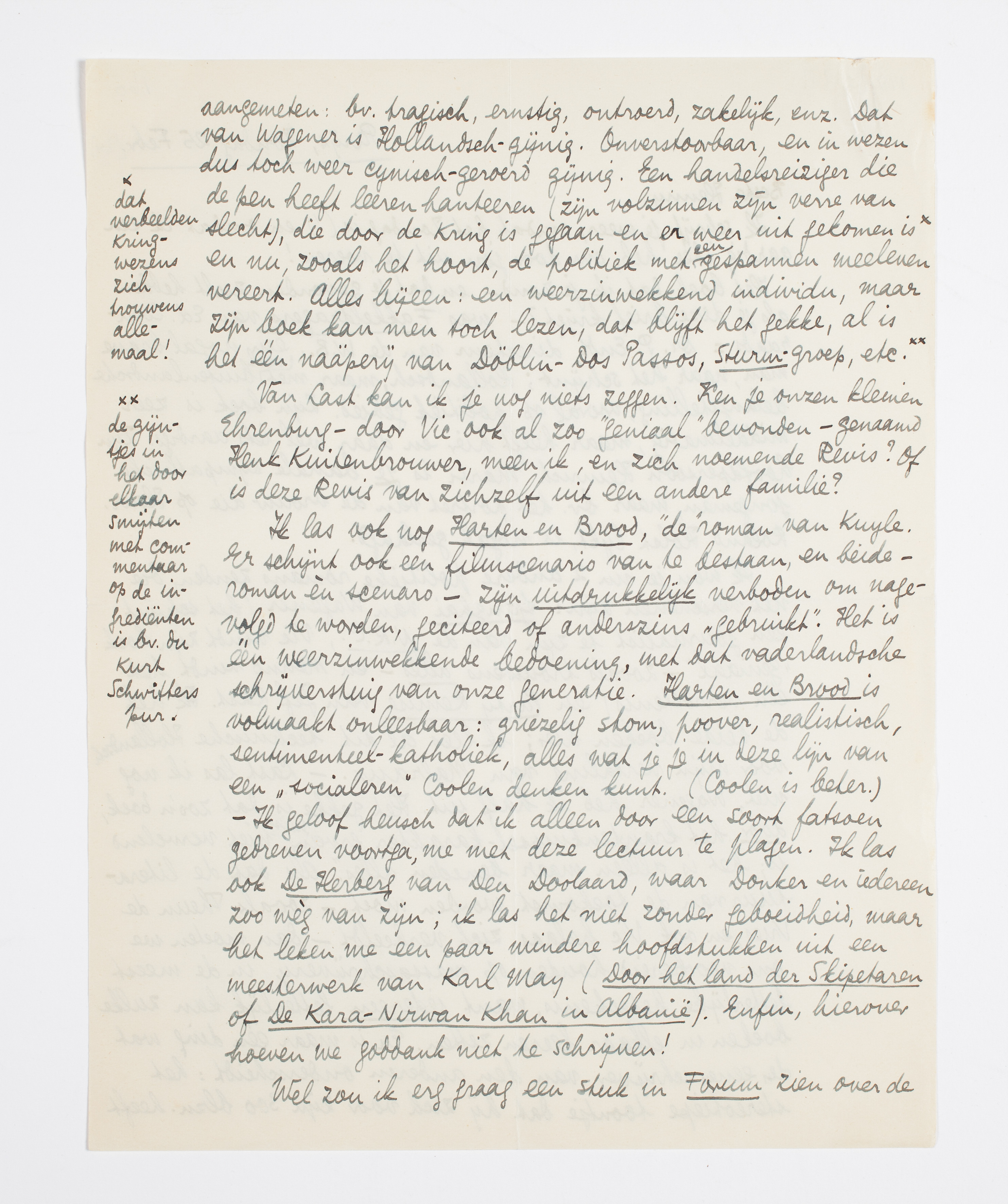 Ik las ook nog Harten en Brood, ‘de’ roman van Kuyle. Er schijnt ook een filmscenario van te bestaan, en beide - roman èn scenaro - zijn uitdrukkelijk verboden om nagevolgd te worden, geciteerd of anderzins ‘gebruikt’. Het is één weerzinwekkende bedoening, met dat vaderlandsche schrijverstuig van onze generatie. Harten en Brood is volmaakt onleesbaar: griezelig stom, poover, realis-tisch, sentimenteel-katholiek, alles wat je je in deze lijn van een ‘socialeren’ Coolen denken kunt. (Coolen is beter.) - Ik geloof heusch dat ik alleen door een soort fatsoen gedreven voortga, me met deze lectuur te plagen. Ik las ook De Herberg van Den Doolaard, waar Donker en iedereen zoo wèg van zijn; ik las het niet zonder geboeidheid, maar het leken me een paar mindere hoofdstukken uit een meesterwerk van Karl May (Door het land der Skipetaren of De Kara-Nirwan Khan in Albanië). Enfin, hierover hoeven we goddank niet te schrijven!