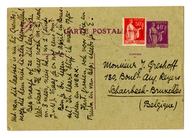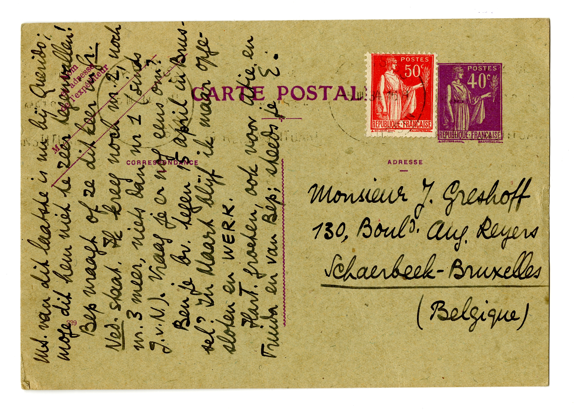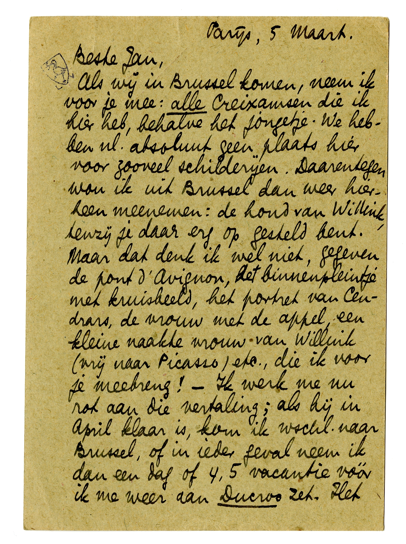 Als wij in Brussel komen, neem ik voor je mee: alle Creixamsen die ik hier heb, behalve het jongetje. We hebben nl. absoluut geen plaats hier voor zooveel schilderijen. Daarentegen wou ik uit Brussel dan weer hierheen meenemen: de hond van Willink, tenzij je daar erg op gesteld bent. Maar dat denk ik wel niet, gegeven de pont d'Avignon, het binnenpleintje met kruisbeeld, het portret van Cen-drars, de vrouw met de appel, een kleine naakte vrouw van Willink (vrij naar Picasso) etc., die ik voor je meebreng! - Ik werk me nu rot aan die vertaling; als hij in April klaar is, kom ik wschl. naar Brussel, of in ieder geval neem ik dan een dag of 4, 5 vacantie vóór ik me weer aan Ducroo zet. Het MS. van dit laatste is nu bij Querido; moge dit hem niet te zeer tegenvallen!