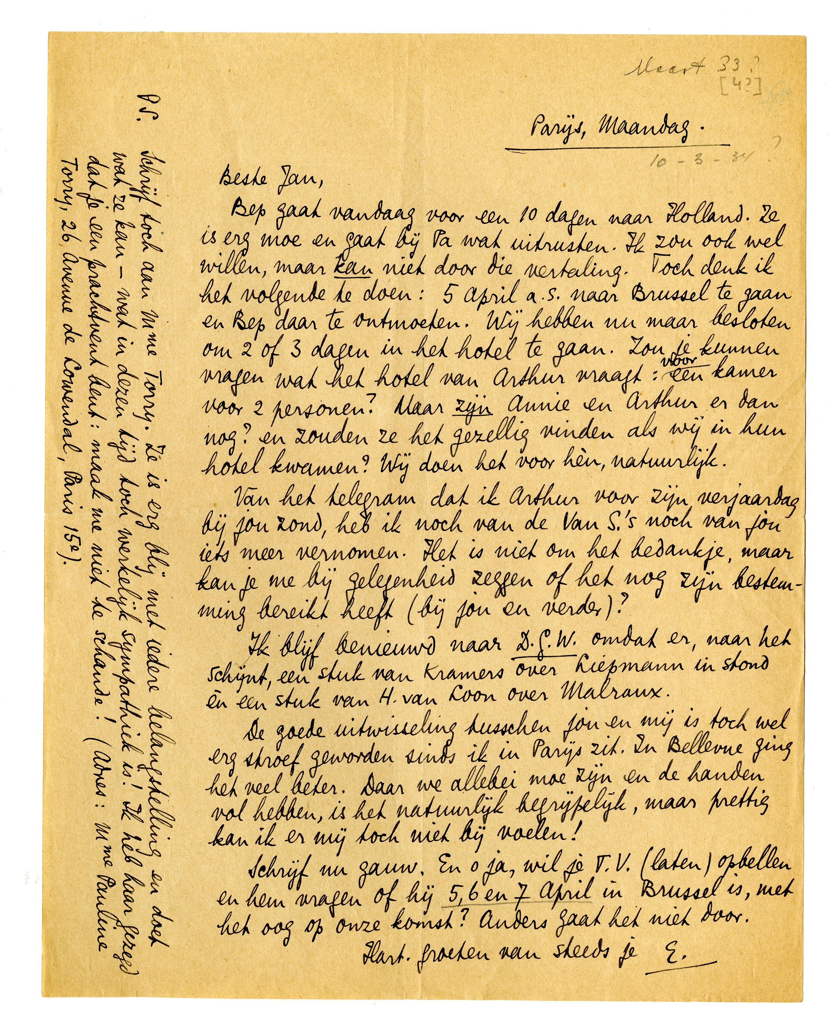 De goede uitwisseling tusschen jou en mij is toch wel erg stroef geworden sinds ik in Parijs zit. In Bellevue ging het veel beter. Daar we allebei moe zijn en de handen vol hebben, is het natuurlijk begrijpelijk, maar prettig kan ik mij er toch niet bij voelen!