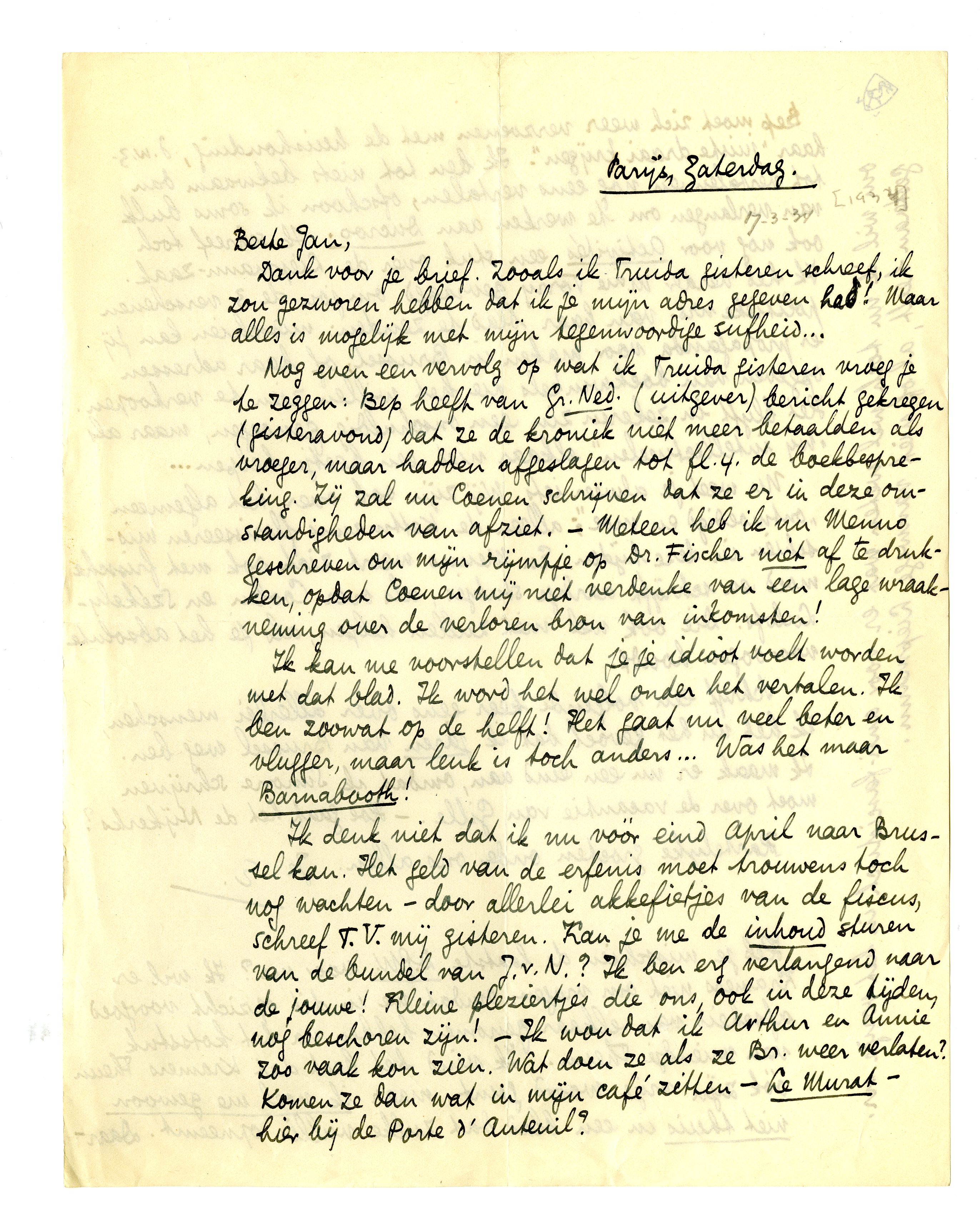Ik denk niet dat ik nu vóór eind April naar Brussel kan. Het geld van de erfenis moet trouwens toch nog wachten - door allerlei akkefietjes van de fiscus, schreef T.V. mij gisteren. Kan je me de inhoud sturen van de bundel van J.v.N.?3126 Ik ben erg verlangend naar de jouwe!3127 Kleine pleziertjes die ons, ook in deze tijden, nog beschoren zijn! - Ik wou dat ik Arthur en Annie zoo vaak kon zien. Wat doen ze als ze Br. weer verlaten? Komen ze dan wat in mijn café zitten - Le Murat - hier bij de Porte d'Auteuil?