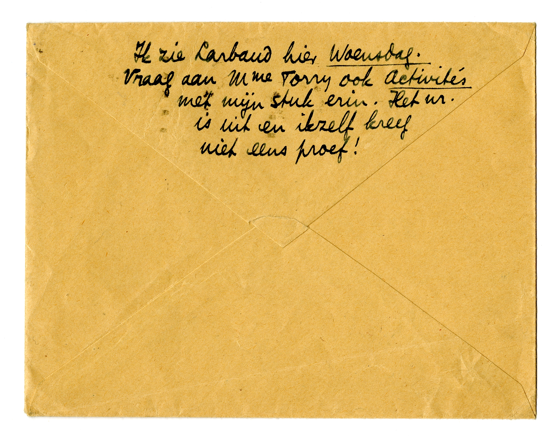 Geheimschrift van J.v.N. ontvangen en met verrukking gelezen. Ik schrijf hem er nog over, of spreek erover als ik in Brussel kom. - Ik kan hoogstwschl. niet vóór den 6en. Schrijf Timmers dat dus. Het idee van die klok lijkt me subliem, zoowel uit een practisch als een moreel oogpunt.