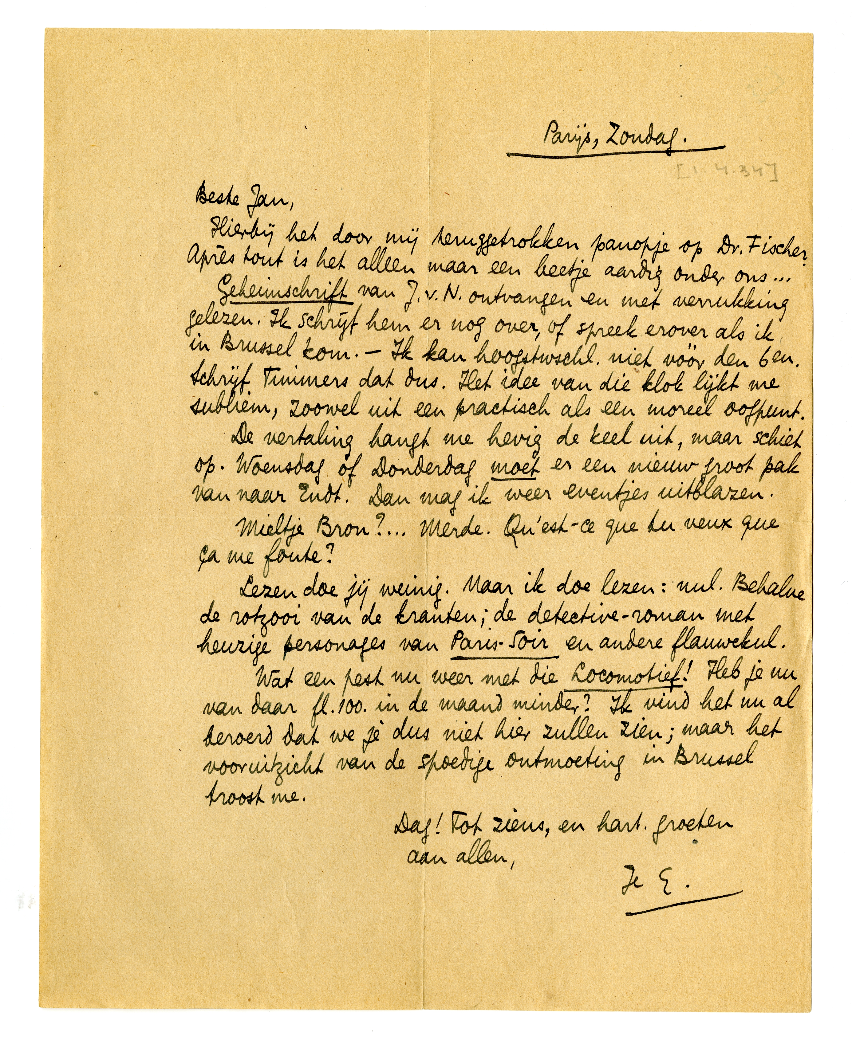 Wat een pest nu weer met die Locomotief!3143 Heb je nu van daar fl.100. in de maand minder? Ik vind het nu al beroerd dat we je dus niet hier zullen zien; maar het vooruitzicht van de spoedige ontmoeting in Brussel troost me.