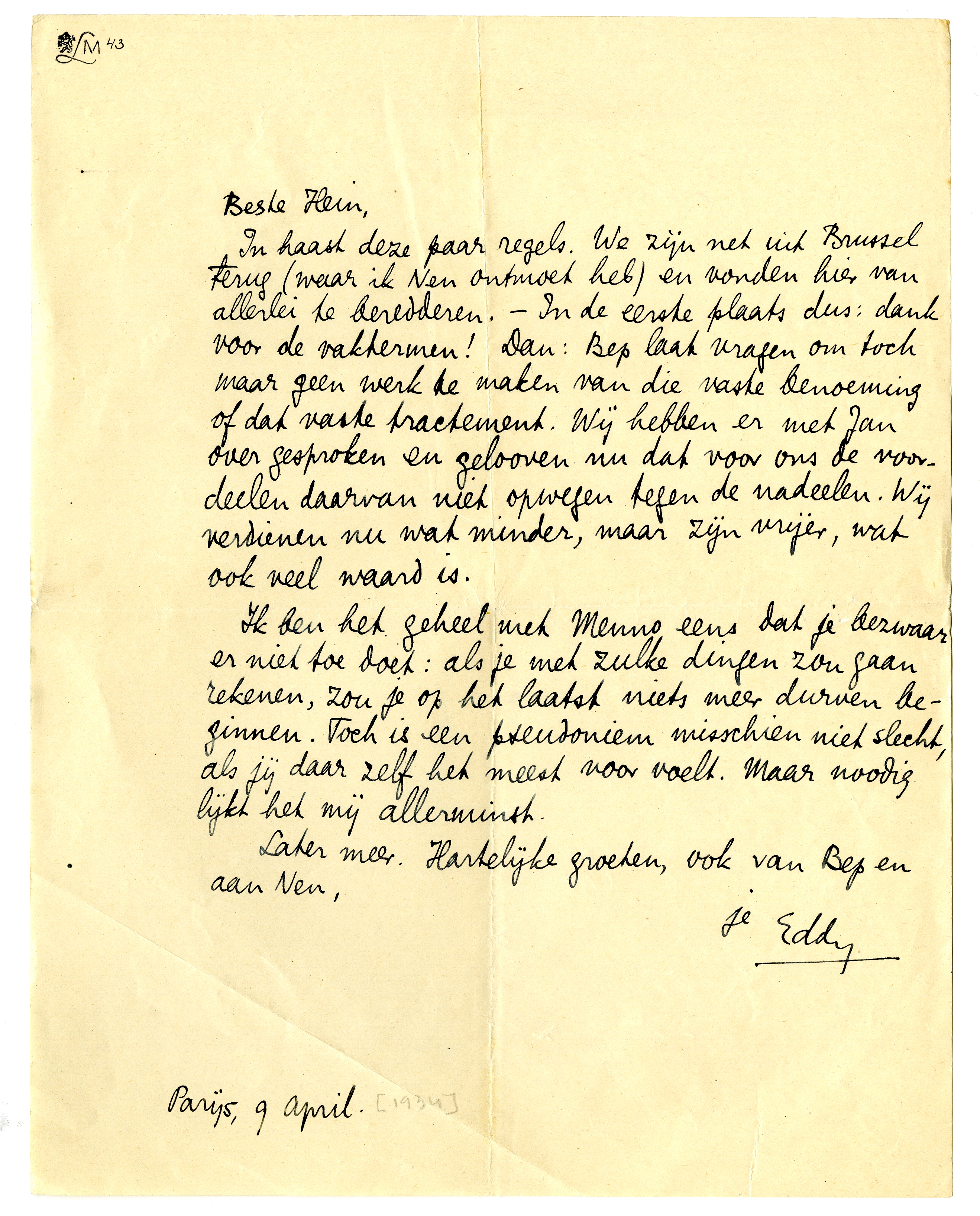 In haast deze paar regels. We zijn net uit Brussel terug (waar ik Nen ontmoet heb) en vonden hier van allerlei te beredderen. - In de eerste plaats dus: dank voor de vaktermen! Dan: Bep laat vragen om toch maar geen werk te maken van die vaste benoeming of dat vaste tractement. Wij hebben er met Jan over gesproken en gelooven nu dat voor ons de voordeelen daarvan niet opwegen tegen de nadeelen. Wij verdienen nu wat minder, maar zijn vrijer, wat ook veel waard is.