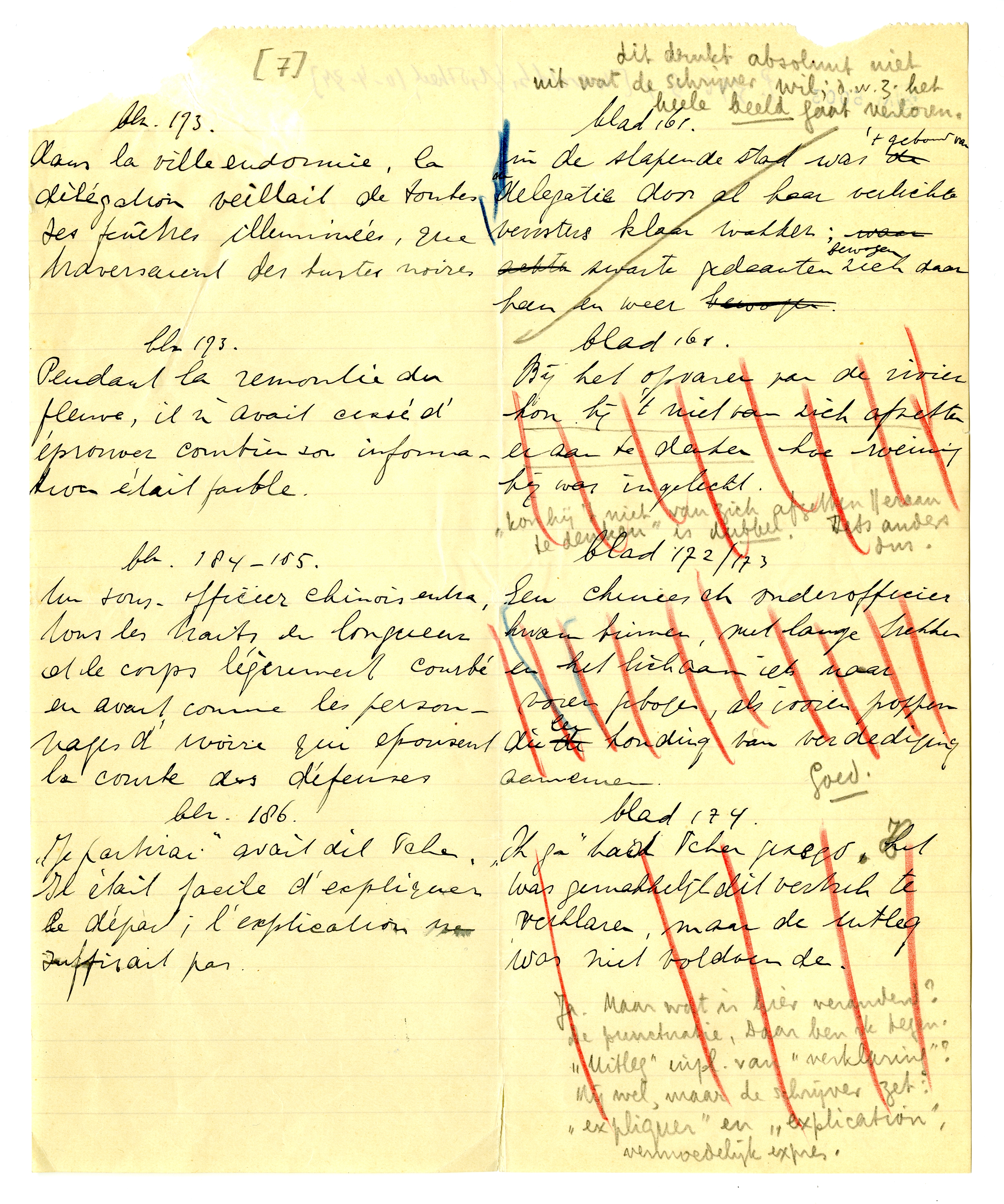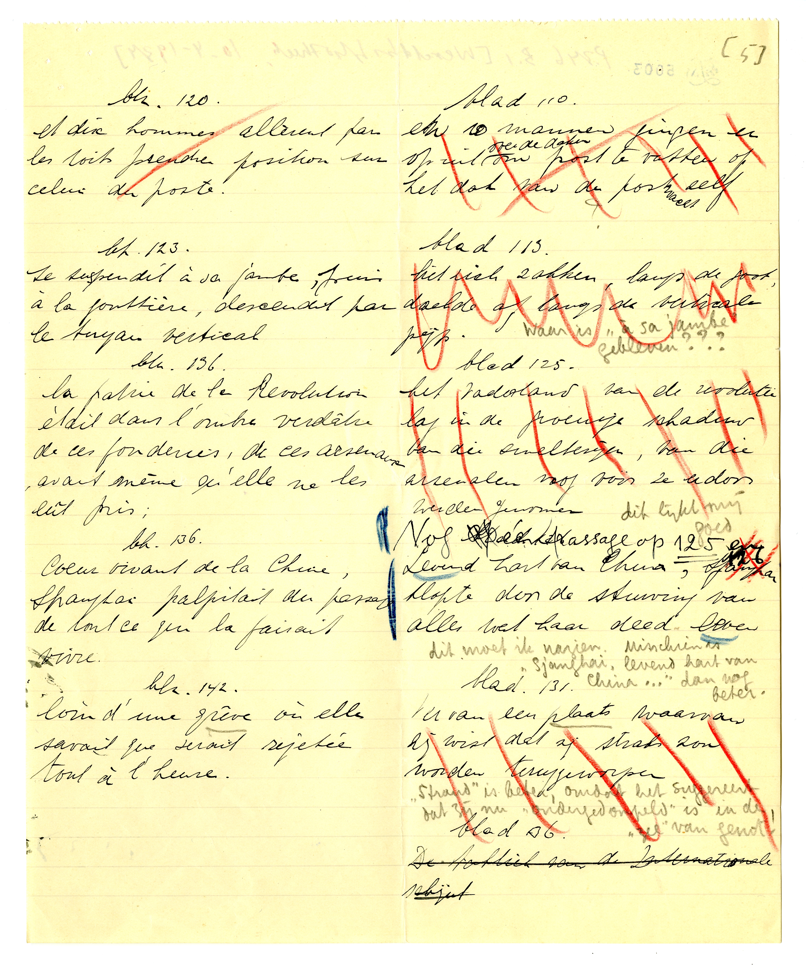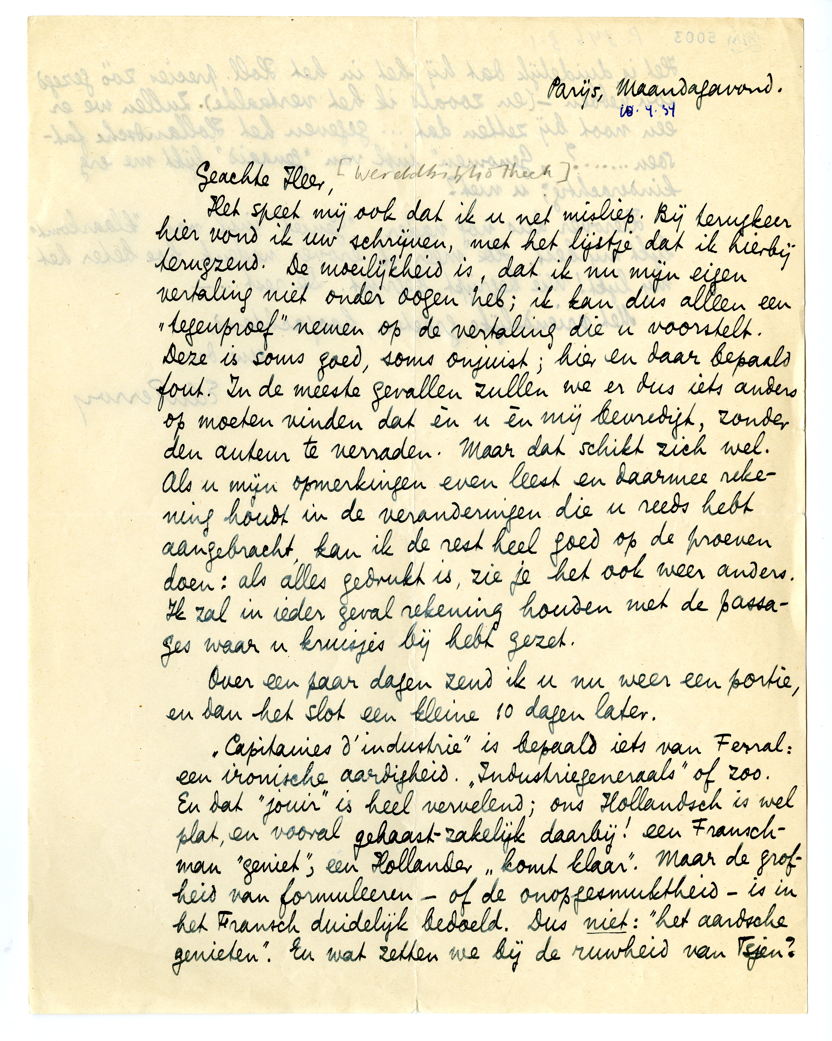 Het speet mij ook dat ik u net misliep. Bij terugkeer hier vond ik uw schrijven, met het lijstje dat ik hierbij terugzend. De moeilijkheid is, dat ik nu mijn eigen vertaling niet onder oogen heb; ik kan dus alleen een ‘tegenproef’ nemen op de vertaling die u voorstelt. Deze is soms goed, soms onjuist; hier en daar bepaald fout. In de meeste gevallen zullen we er dus iets anders op moeten vinden dat èn u èn mij bevredigt, zonder den auteur te verraden. Maar dat schikt zich wel. Als u mijn opmerkingen even leest en daarmee rekening houdt in de veranderingen die u reeds hebt aangebracht, kan ik de rest heel goed op de proeven doen: als alles gedrukt is, zie je het ook weer anders. Ik zal in ieder geval rekening houden met de passages waar u kruisjes bij hebt gezet.