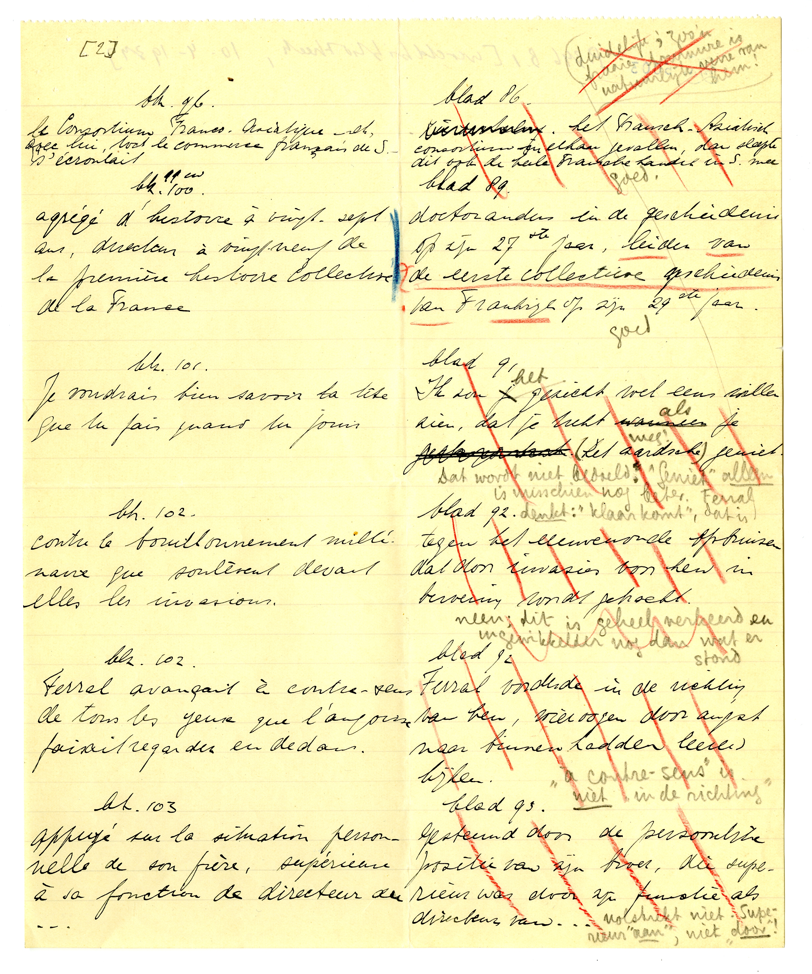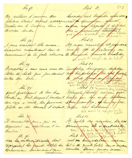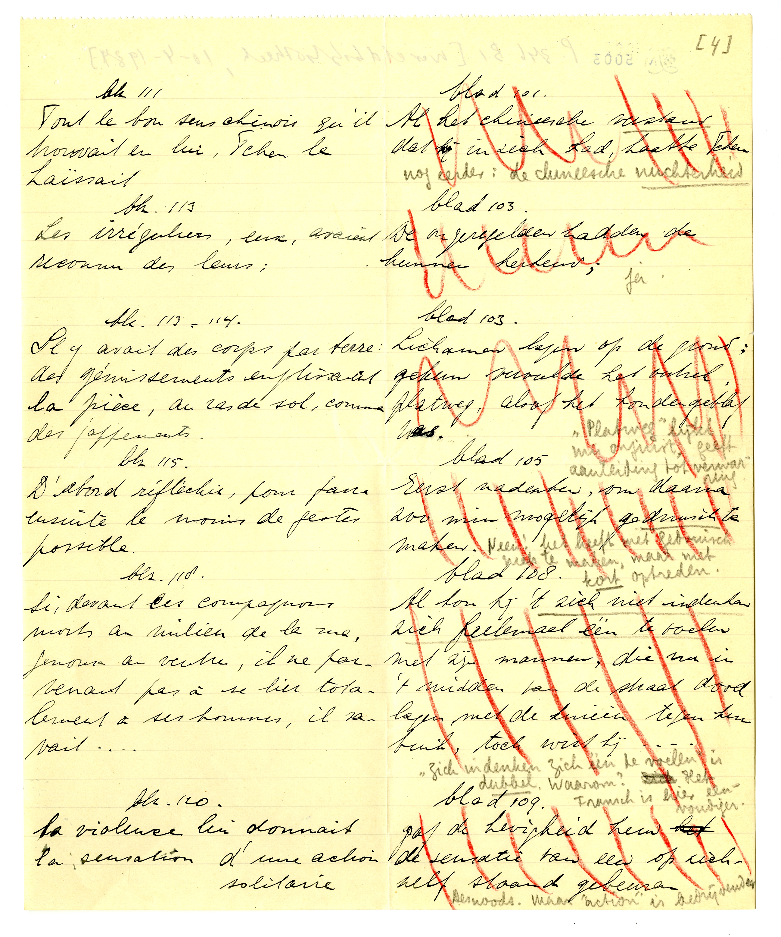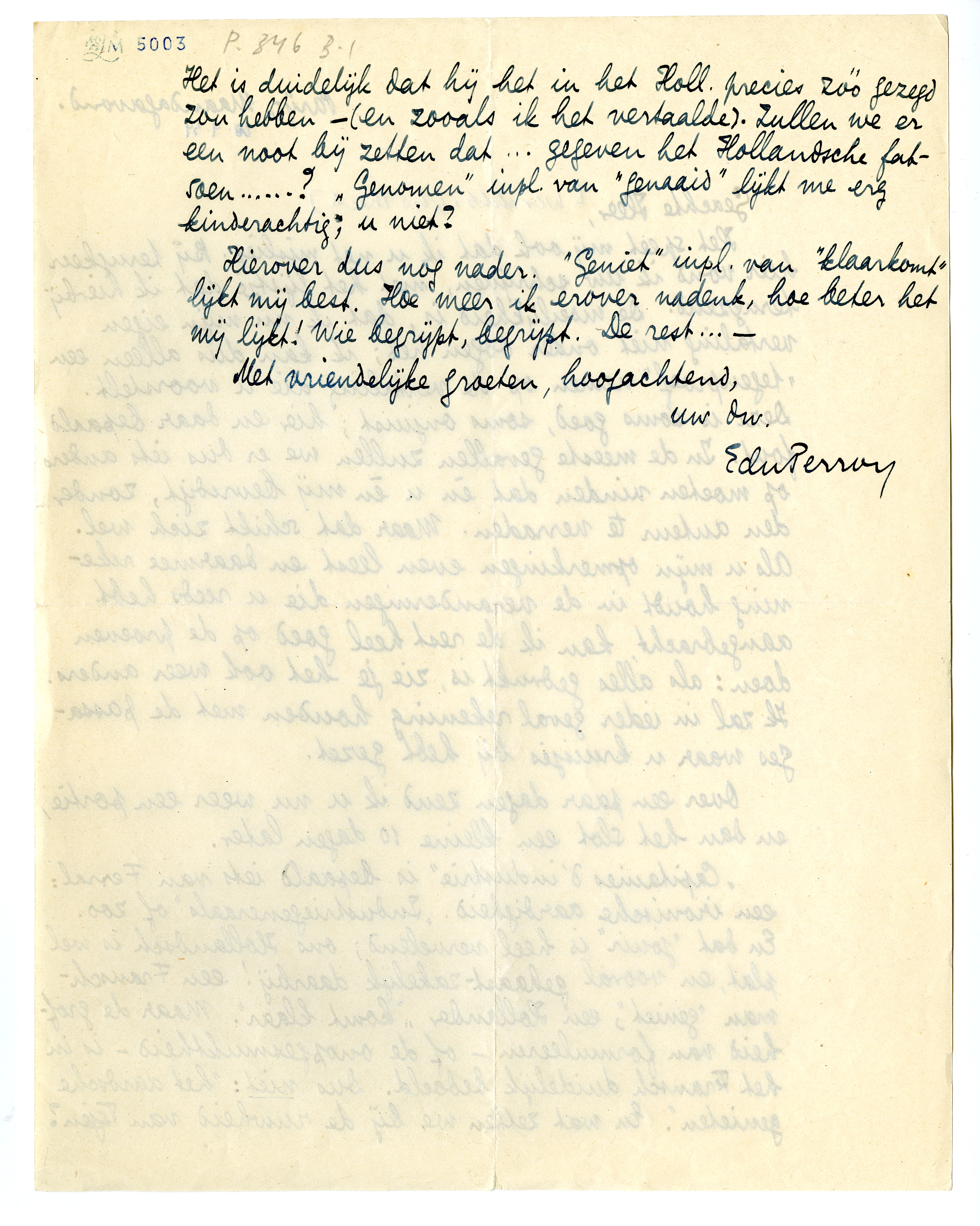 Het speet mij ook dat ik u net misliep. Bij terugkeer hier vond ik uw schrijven, met het lijstje dat ik hierbij terugzend. De moeilijkheid is, dat ik nu mijn eigen vertaling niet onder oogen heb; ik kan dus alleen een ‘tegenproef’ nemen op de vertaling die u voorstelt. Deze is soms goed, soms onjuist; hier en daar bepaald fout. In de meeste gevallen zullen we er dus iets anders op moeten vinden dat èn u èn mij bevredigt, zonder den auteur te verraden. Maar dat schikt zich wel. Als u mijn opmerkingen even leest en daarmee rekening houdt in de veranderingen die u reeds hebt aangebracht, kan ik de rest heel goed op de proeven doen: als alles gedrukt is, zie je het ook weer anders. Ik zal in ieder geval rekening houden met de passages waar u kruisjes bij hebt gezet.
