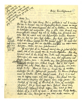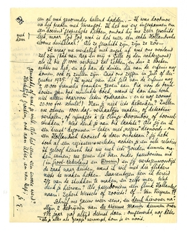 Ik vraag me werkelijk met angst af wat ons voorland zal zijn (dat van Bep en mij + Gille op den achtergrond) als ik die fl.1000. verdiend zal hebben, en dus 2 boeken achter me heb, en als dan de duiten die van de erfenis nog komen, ook op zullen zijn. Laat ons zeggen in Juli of Augustus 1935. (Ik moet van het geld van de erfenis nog ± 10.000 fransche franken geven aan Pia voor de drukkosten van dat mislukte boek, want ik kan hem toch niet alleen daarvoor laten opdraaien: er is nog zoowat 20.000 frs. schuld!) Kan je niet iets bedenken? Zullen we samen 1001-dag-verhaaltjes maken, of detective-verhalen, of rijmpjes à la Clinge-Doorenbos,3147 of tooneelstukken? Wat denk je van dit laatste? Als jij en ik een ‘trust’ begonnen - later met ‘negers’3148 desnoods - om een Hollandsch tooneel te doen ontstaan? jij hebt toch al een regisseursverleden achter je en vele relaties. Ik geloof heusch dat we wel iets zouden kunnen maken, samen; we geven het dan onder pseudoniem uit (in Groot-Nederland en Forum) en jij vertegenwoordigt de zaak naar buiten, want ik wil met die flikkers niets te maken hebben. Daarentegen ben ik bereid ⅔ van de stukken te maken, en zelfs meer. Wat denk je hiervan? Als pseudoniem een flink Hollandsche naam: Egbert Wessels of zooiets! Of... Van Tuynen?!