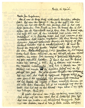 Dank voor de lange brief, uitknipsels, berichten, plaatjes, foto's. Het vers van Redcel ii3151 (ben jij dat zelf?) was heel aardig; als het iets korter was geweest, had ik het nog beter gevonden. Over Kuyle en over Ter Braak3152 ben ik het alleen aan de oppervlakte met je eens, over Ter Braak eigenlijk zelfs dàt niet. Ik kan werkelijk niet inzien wat er ‘ontstellend’ is in Dumay, maar ook niet waarom je die ontsteltenis hebt moeten weglachen. (Al deze termen zijn trouwens typisch-polemische termen, die weinig of geen verband houden met de werkelijkheid). Ik vind Ter Braak een oneindig grooter ‘stylist’ zelfs dan Kuyle, die dom, Hollandsch-gijnig, d.w.z. geestloos, is, het nieuwe proza heeft leeren schrijven, en nu schrijft, als een schoolmeester, en wiens low cunning + ‘poëtische’ bladzijdjes mij geen oogenblik bedotten. Je kunt het met Ter Braak oneens zijn zooveel je wilt: hij is daarom niet minder een rasechte intelligentie (ook hier is sprake van rasechtheid, niet minder dan bij dichters, geloof me) en hij ‘schrijft’ zeer goed. Het al-te-dwaas-berijden-van-stokpaardjes zegt niet veel: dat heeft de tijdgenoot ongeveer altijd gezegd voor iemand die werkelijk zijn persoonlijke waarheid tot het laatste toe najoeg. - Maar misschien kunnen we dit alles beter bespreken als je me werkelijk nog eens opzoekt. Met het oog op dat bezoek: mijn adres is nu 17bis rue Erlanger, Paris (16e).