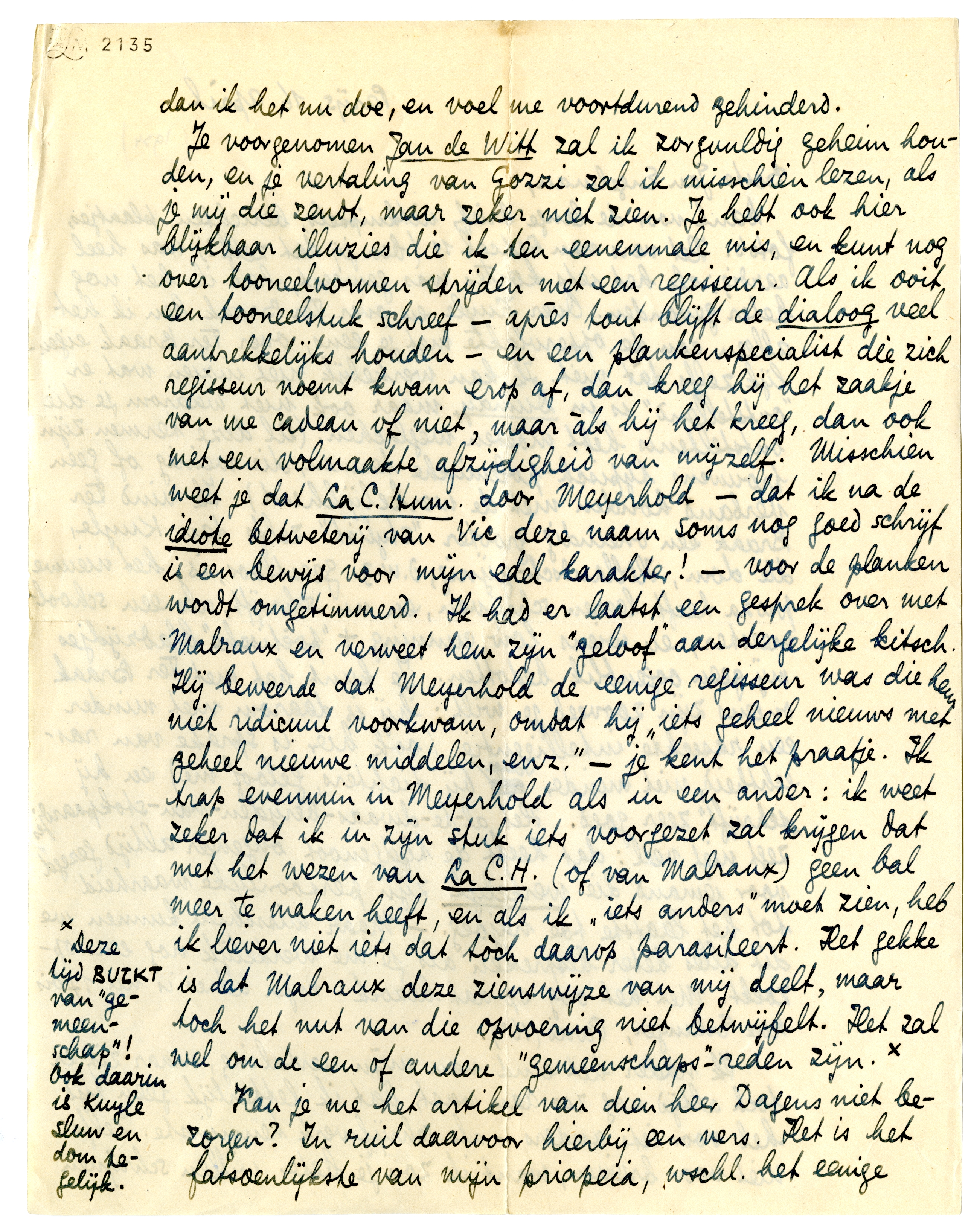 Je voorgenomen Jan de Witt3153 zal ik zorgvuldig geheim houden, en je vertaling van Gozzi3154 zal ik misschien lezen, als je mij die zendt, maar zeker niet zien. Je hebt ook hier blijkbaar illuzies die ik ten eenenmale mis, en kunt nog over tooneelvormen strijden met een regisseur. Als ik ooit een tooneelstuk schreef - après tout blijft de dialoog veel aantrekkelijks houden - en een plankenspecialist die zich regisseur noemt kwam erop af, dan kreeg hij het zaakje van me cadeau of niet, maar àls hij het kreeg, dan ook met een volmaakte afzijdigheid van mijzelf. Misschien weet je dat La C. Hum. door Meyerhold - dat ik na de idiote betweterij van Vic deze naam soms nog goed schrijf is een bewijs voor mijn edel karakter! - voor de planken wordt omgetimmerd. Ik had er laatst een gesprek over met Malraux en verweet hem zijn ‘geloof’ aan dergelijke kitsch. Hij beweerde dat Meyerhold de eenige regisseur was die hem niet ridicuul voorkwam, omdat hij ‘iets geheel nieuws met geheel nieuwe middelen, enz.’ - je kent het praatje. Ik trap evenmin in Meyerhold als in een ander: ik weet zeker dat ik in zijn stuk iets voorgezet zal krijgen dat met het wezen van La C.H. (of van Malraux) geen bal meer te maken heeft, en als ik ‘iets anders’ moet zien, heb ik liever niet iets dat tòch daarop parasiteert. Het gekke is dat Malraux deze zienswijze van mij deelt, maar toch het nut van die opvoering niet betwijfelt. Het zal wel om de een of andere ‘gemeenschaps’-reden zijn.*