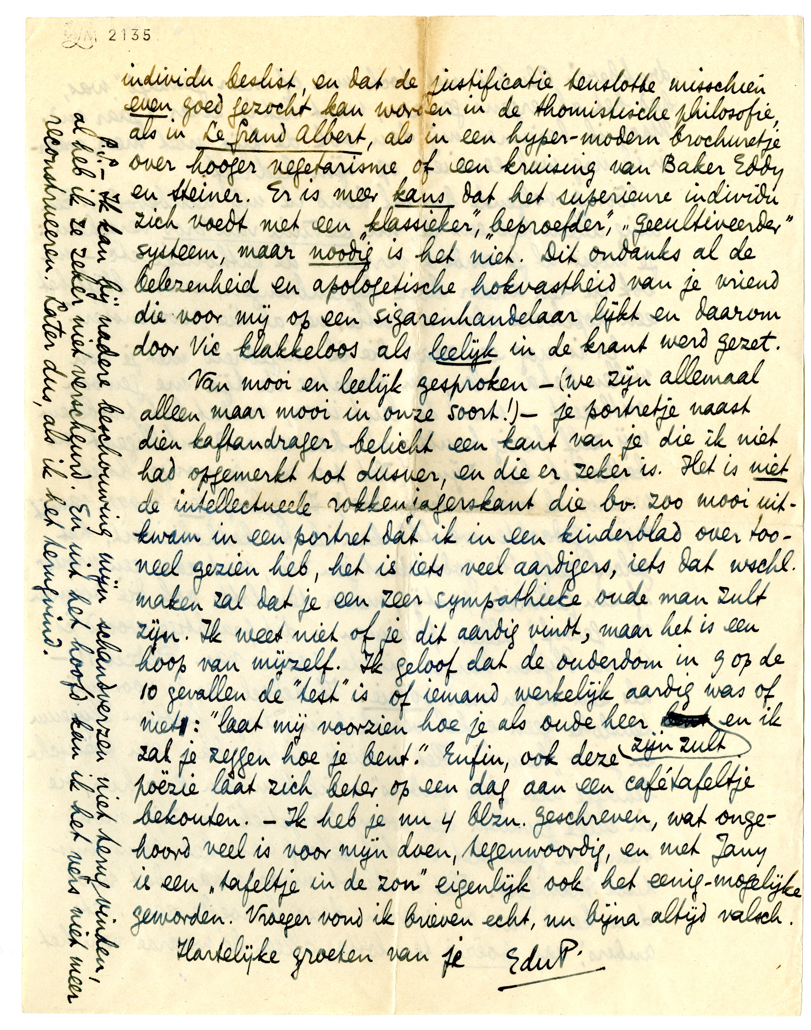 Van mooi en leelijk gesproken - (we zijn allemaal alleen maar mooi in onze soort!) - je portretje naast dien kaftandrager3162 belicht een kant van je die ik niet had opgemerkt tot dusver, en die er zeker is. Het is niet de intellectueele rokkenjagerskant die bv. zoo mooi uitkwam in een portret dat ik in een kinderblad over tooneel gezien heb, het is iets veel aardigers, iets dat wschl. maken zal dat je een zeer sympathieke oude man zult zijn. Ik weet niet of je dit aardig vindt, maar het is een hoop van mijzelf. Ik geloof dat de ouderdom in 9 op de 10 gevallen de ‘test’ is of iemand werkelijk aardig was of niet: ‘laat mij voorzien hoe je als oude heer zijn zult en ik zal je zeggen hoe je bent.’ Enfin, ook deze poëzie laat zich beter op een dag aan een cafétafeltje bekouten. - Ik heb je nu 4 blzn. geschreven, wat ongehoord veel is voor mijn doen, tegenwoordig, en met Jany is een ‘tafeltje in de zon’ eigenlijk ook het eenig-mogelijke geworden. Vroeger vond ik brieven echt, nu bijna altijd valsch.