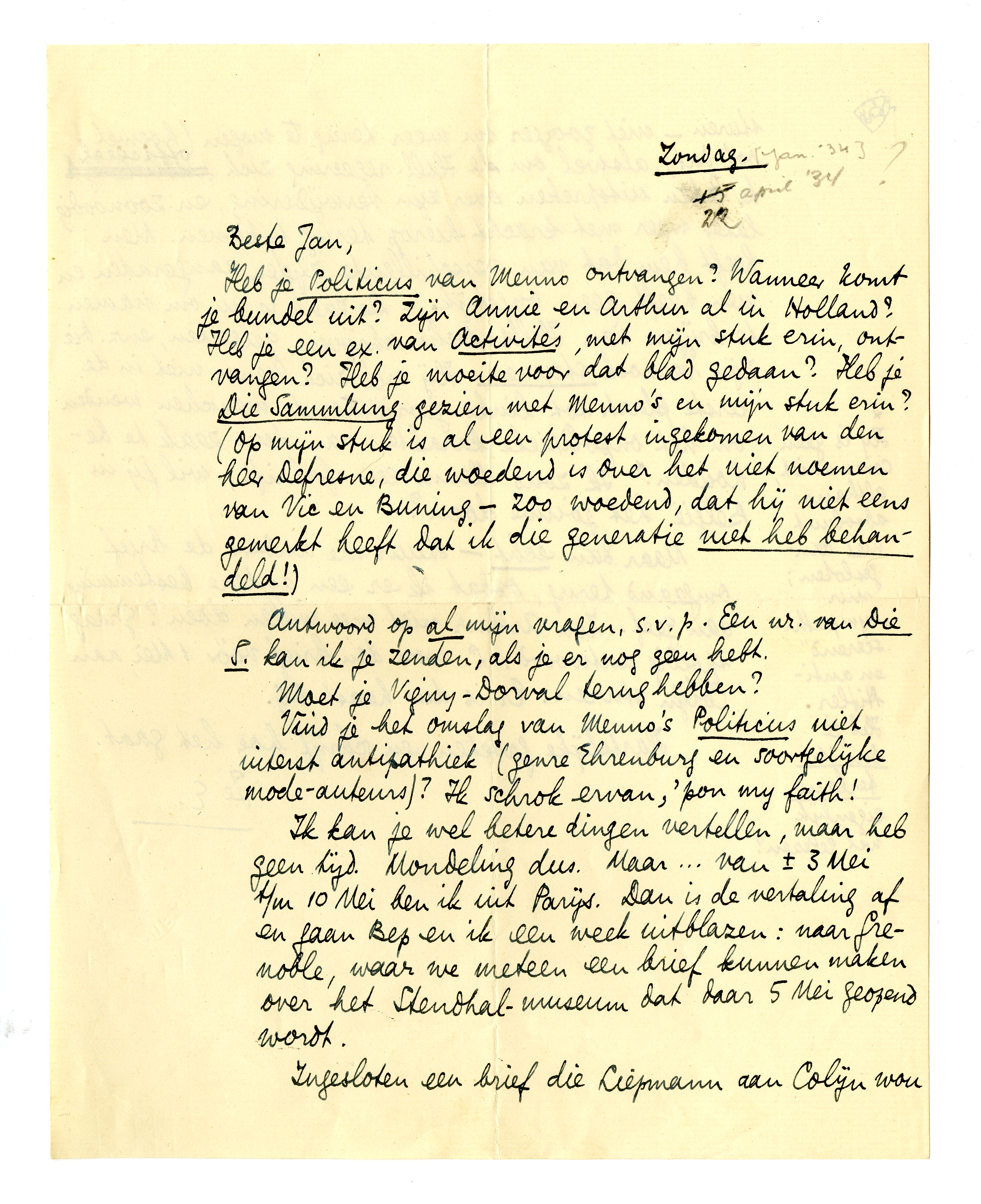 Heb je Politicus van Menno ontvangen? Wanneer komt je bundel3164 uit? Zijn Annie en Arthur al in Holland? Heb je een ex. van Activités, met mijn stuk erin, ontvangen? Heb je moeite voor dat blad gedaan? Heb je Die Sammlung gezien met Menno's en mijn stuk erin? (Op mijn stuk is al een protest ingekomen van den heer Defresne,3165 die woedend is over het niet noemen van Vic en Buning - zoo woedend, dat hij niet eens gemerkt heeft dat ik die generatie niet heb behandeld!)