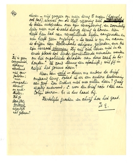 Ingesloten een brief die Liepmann aan Colijn wou sturen3168 - niet zoozeer om weer terug te mogen (hoewel ook dat), alswel om de Holl. regeering zich officieel te laten uitspreken over zijn verwijdering, en zoonoodig later weer met kracht hierop terug te komen. Men heeft hem dat van verschillende zijden aangeraden en men heeft geen ongelijk. - De zaak is nu om namen te krijgen van Hollandsche schrijvers, geleerden, enz. die zijn verzoek steunen. Hij wil zich liever niet in de eerste plaats tot links-georiënteerde menschen wenden om het onpolitieke karakter van deze zaak te behouden.* Ik zond Menno een afschrift; wil jij in België het jouwe doen?