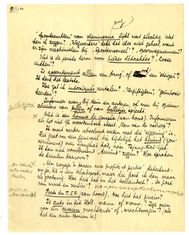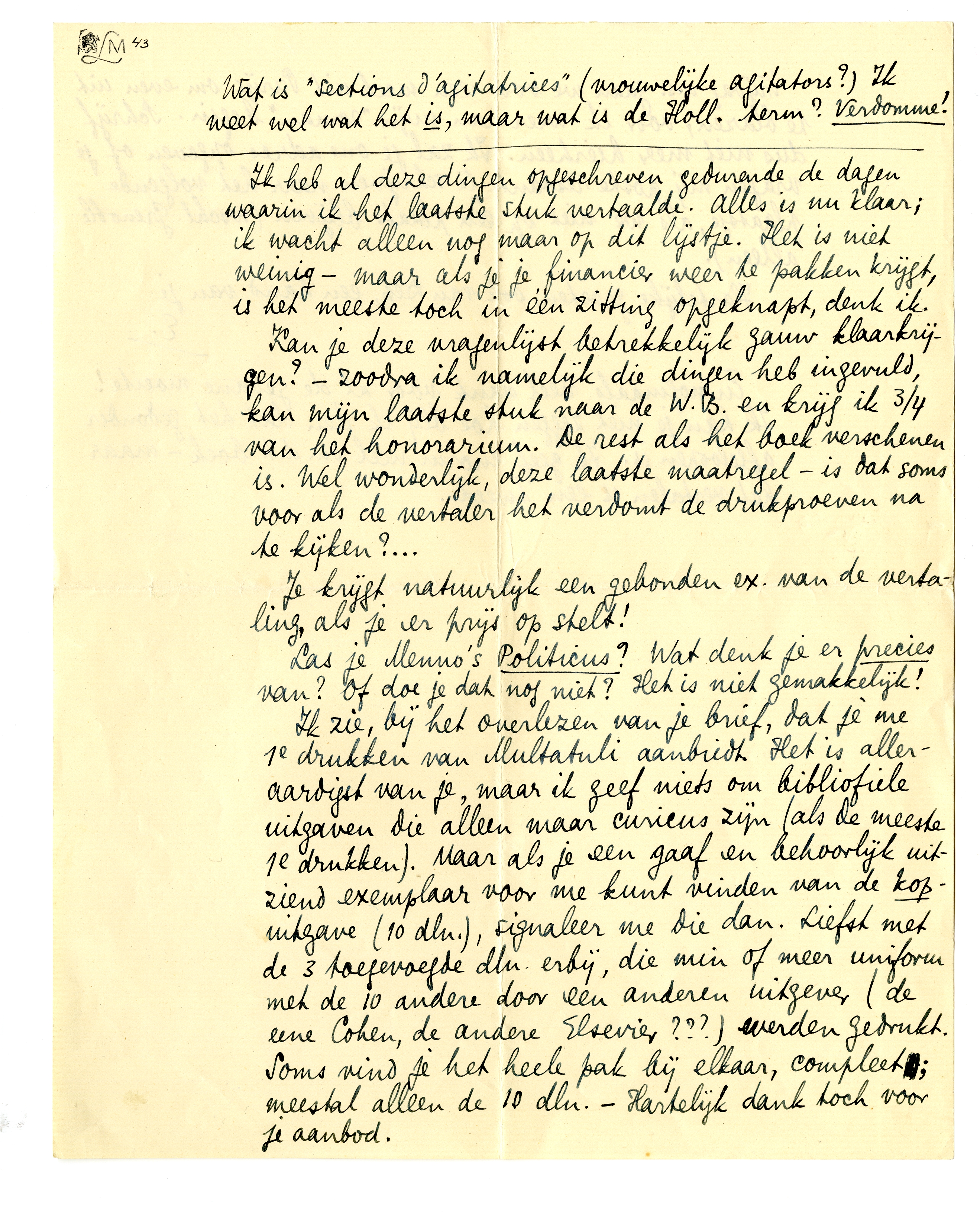 Kan je deze vragenlijst betrekkelijk gauw klaarkrijgen? - zoodra ik namelijk die dingen heb ingevuld, kan mijn laatste stuk naar de W.B. en krijg ik 3/4 van het honorarium. De rest als het boek ver-schenen is. Wel wonderlijk, deze laatste maatregel - is dat soms voor als de vertaler het verdomt de drukproeven na te kijken?...
