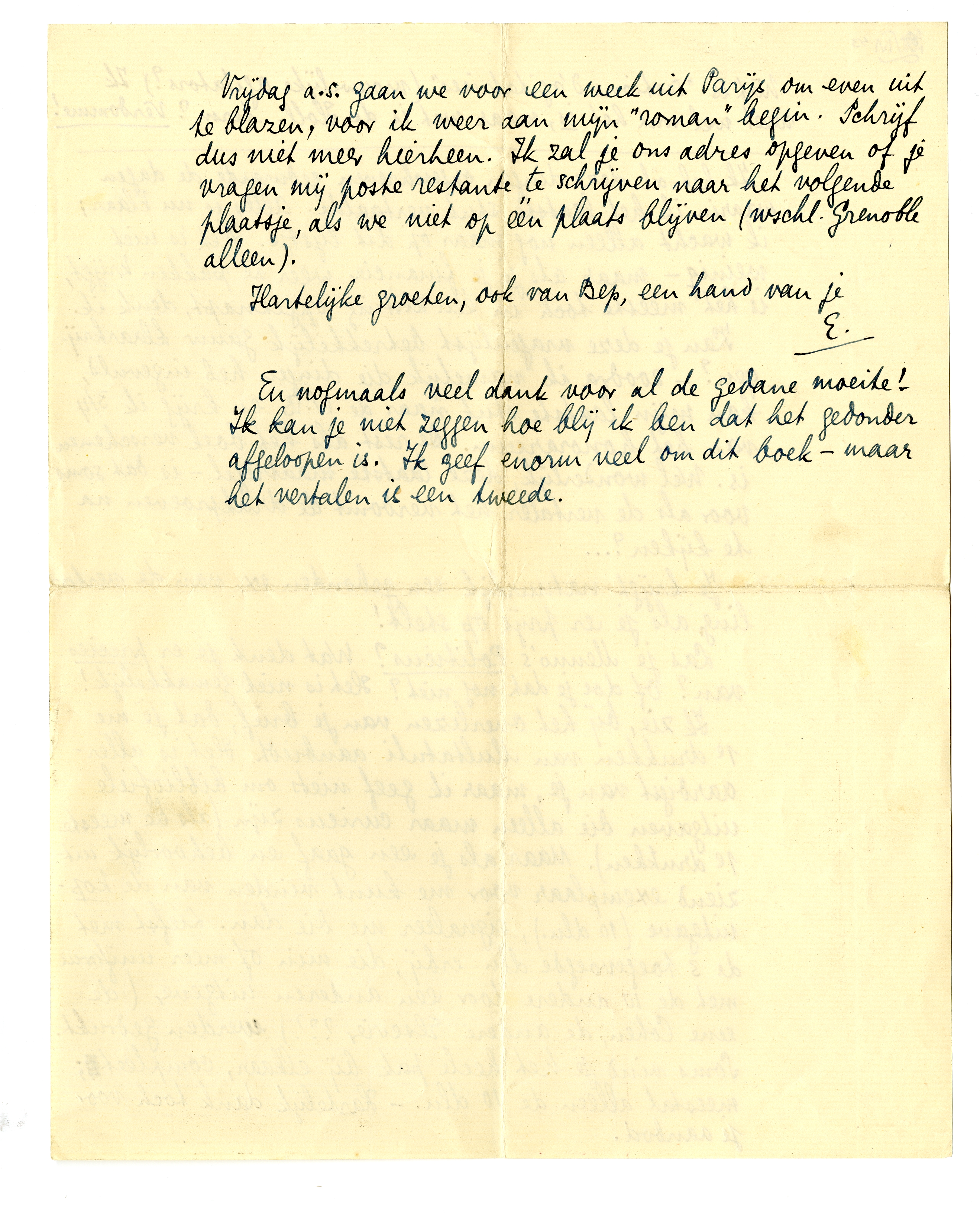 Vrijdag a.s. gaan we voor een week uit Parijs om even uit te blazen, voor ik weer aan mijn ‘roman’ begin. Schrijf dus niet meer hierheen. Ik zal je ons adres opgeven of je vragen mij poste restante te schrijven naar het volgende plaatsje, als we niet op één plaats blijven (wschl. Grenoble alleen).