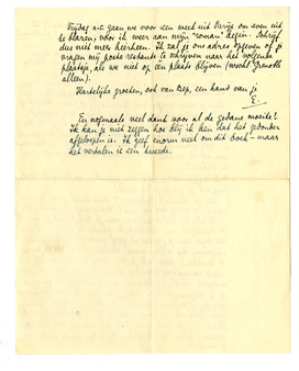 Ik zie, bij het overlezen van je brief, dat je me 1e drukken van Multatuli aanbiedt. Het is alleraardigst van je, maar ik geef niets om bibliofiele uitgaven die alleen maar curieus zijn (als de meeste 1e drukken). Maar als je een gaaf en behoorlijk uitziend exemplaar voor me kunt vinden van de kop-uitgave (10 dln.), signaleer me die dan. Liefst met de 3 toegevoegde dln. erbij, die min of meer uniform met de 10 andere door een anderen uitgever (de eene Cohen, de andere Elsevier???) werden gedrukt. Soms vind je het heele pak bij elkaar, compleet; meestal alleen de 10 dln. - Hartelijk dank toch voor je aanbod.