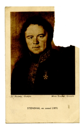 Hierbij het laatst-ontdekte portret van Beyle (52 jaar oud). Het kleine museumpje hier is eig. niet veel meer dan een portrettenkabinet, maar het werd ondergebracht in een soortement klooster, zoodat Stendhal even ‘bezorgd’ kan zijn over zijn nagedachtenis als Rimbaud. Speur naar de Gratie op dit aangelaat! (Hij was ook ‘lang niet een Adonis’, maar niet zoo leelijk als A.v.D. en Plasschaert). Hartelijk gegroet door je