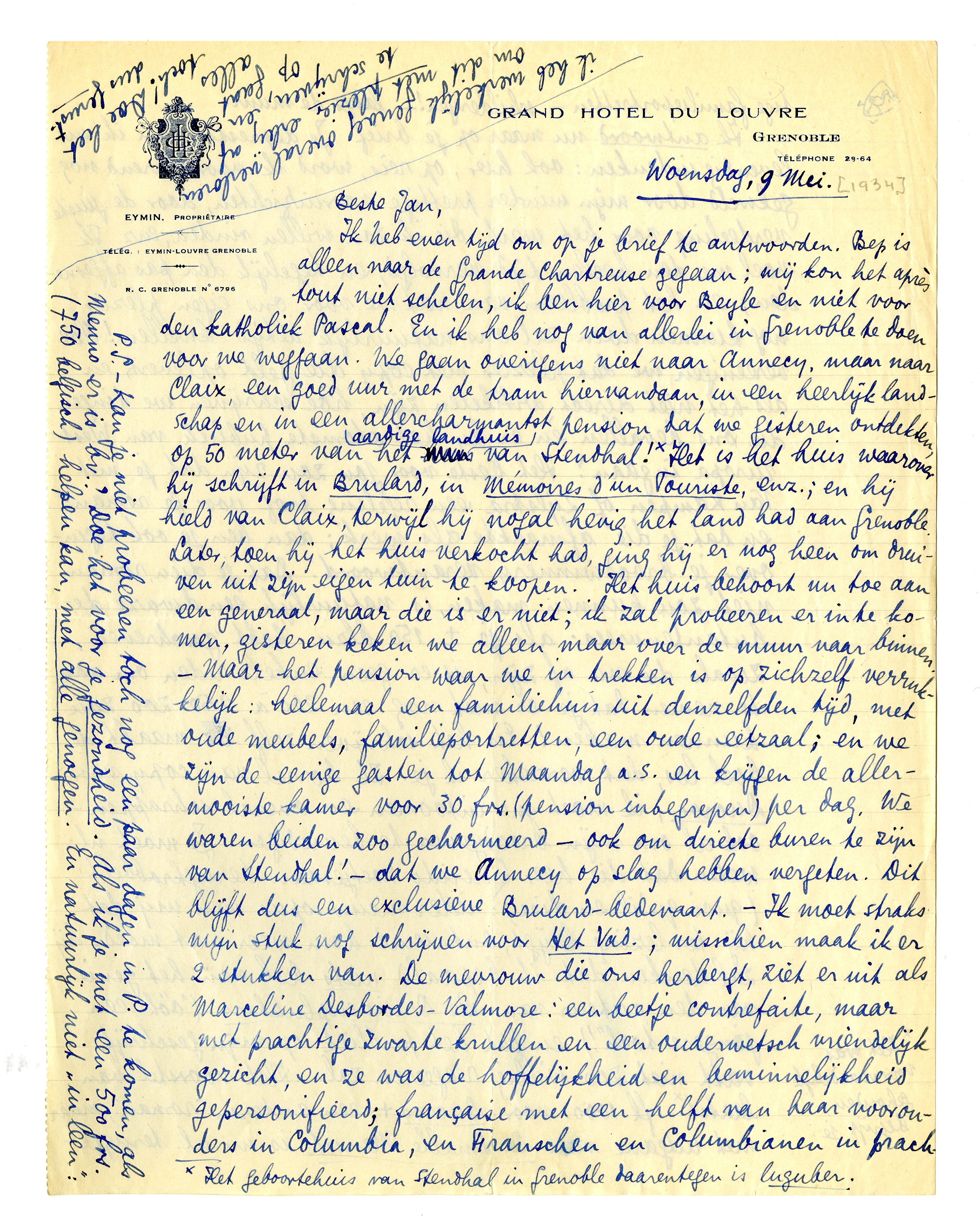Ik heb even tijd om op je brief te antwoorden. Bep is alleen naar de Grande Chartreuse gegaan; mij kon het après tout niet schelen, ik ben hier voor Beyle en niet voor den katholiek Pascal. En ik heb nog van allerlei in Grenoble te doen voor we weggaan. We gaan overigens niet naar Annecy, maar naar Claix, een goed uur met de tram hiervandaan, in een heerlijk landschap en in een allercharmantst pension dat we gisteren ontdekten, op 50 meter van het aardige landhuis van Stendhal!* Het is het huis waarover hij schrijft in Brulard, in Mémoires d'un Touriste, enz.; en hij hield van Claix, terwijl hij nogal hevig het land had aan Grenoble. Later, toen hij het huis verkocht had, ging hij er nog heen om druiven uit zijn eigen tuin te koopen. Het huis behoort nu toe aan een generaal, maar die is er niet; ik zal probeeren er in te komen, gisteren keken we alleen maar over de muur naar binnen. - Maar het pension waar we in trekken is op zichzelf verrukkelijk: heelemaal een familiehuis uit denzelfden tijd, met oude meubels, familieportretten, een oude eetzaal; en we zijn de eenige gasten tot Maandag a.s. en krijgen de allermooiste kamer voor 30 frs. (pension inbegrepen) per dag. We waren beiden zoo gecharmeerd - ook om directe buren te zijn van Stendhal! - dat we Annecy op slag hebben vergeten. Dit blijft dus een exclusieve Brulard-bedevaart. - Ik moet straks mijn stuk nog schrijven voor Het Vad.; misschien maak ik er 2 stukken van. De mevrouw die ons herbergt, ziet er uit als Marceline Desbordes-Valmore: een beetje contrefaite, maar met prachtige zwarte krullen en een ouderwetsch vriendelijk gezicht, en ze was de hoffelijkheid en beminnelijkheid gepersonifieerd; française met een helft van haar voorouders in Columbia, en Franschen en Columbianen in prachtige familieportretten - schilderijen! - langs de muur.