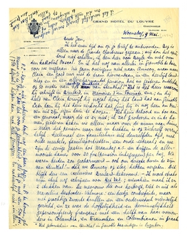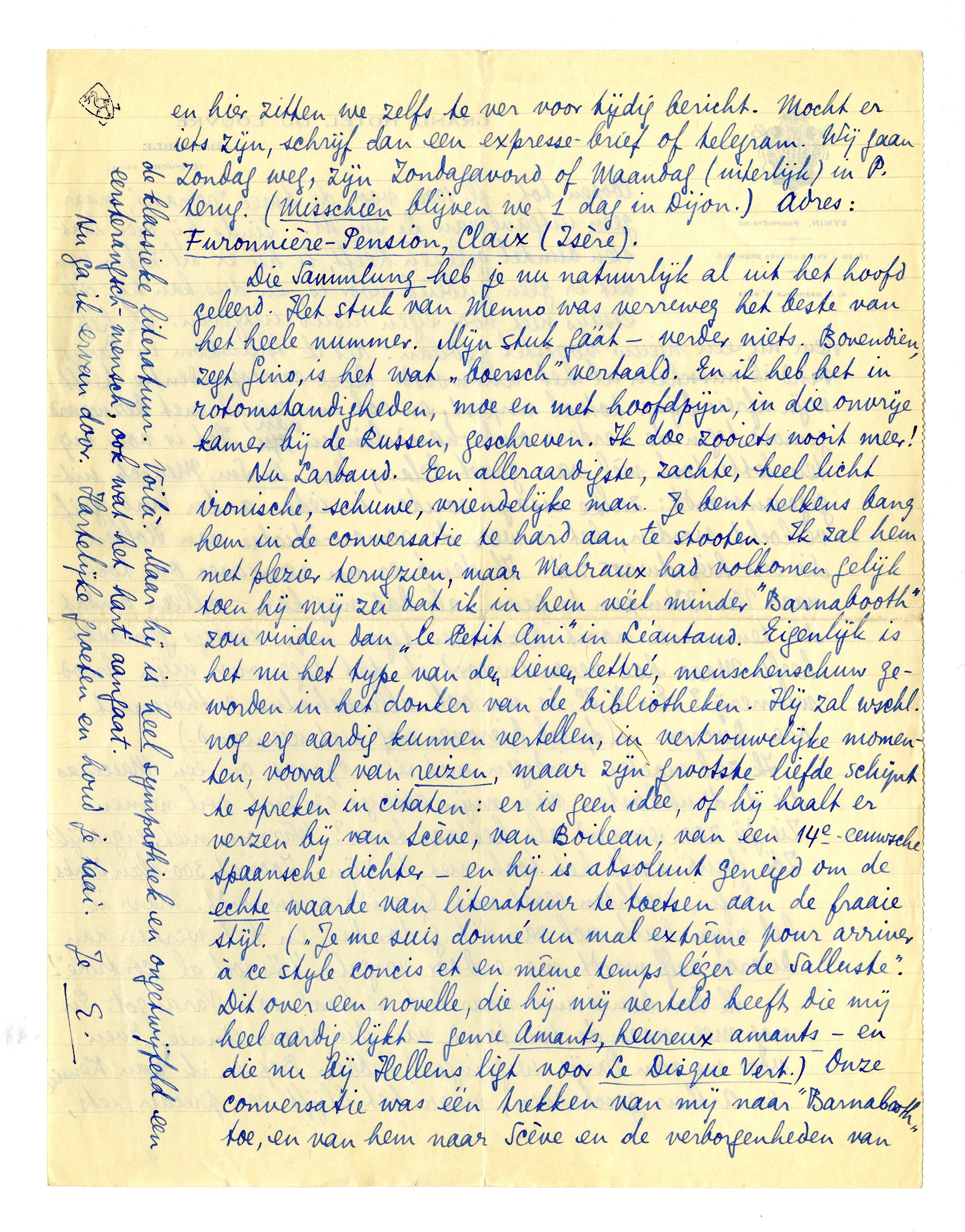 Ik ben benieuwd naar het verhaal van Varangot.3192 En nog meer naar de toestand van die arme Annie.3193 Even voor we van Parijs weggingen, hebben Bep en ik aan Kennie en Arthur geschreven, maar het blijft een precair iets, en hier zitten we zelfs te ver voor tijdig bericht. Mocht er iets zijn, schrijf dan een expresse-brief of telegram. Wij gaan Zondag weg, zijn Zondagavond of Maandag (uiterlijk) in P. terug. (Misschien blijven we 1 dag in Dijon.) Adres: Furonnière-Pension, Claix (Isère).