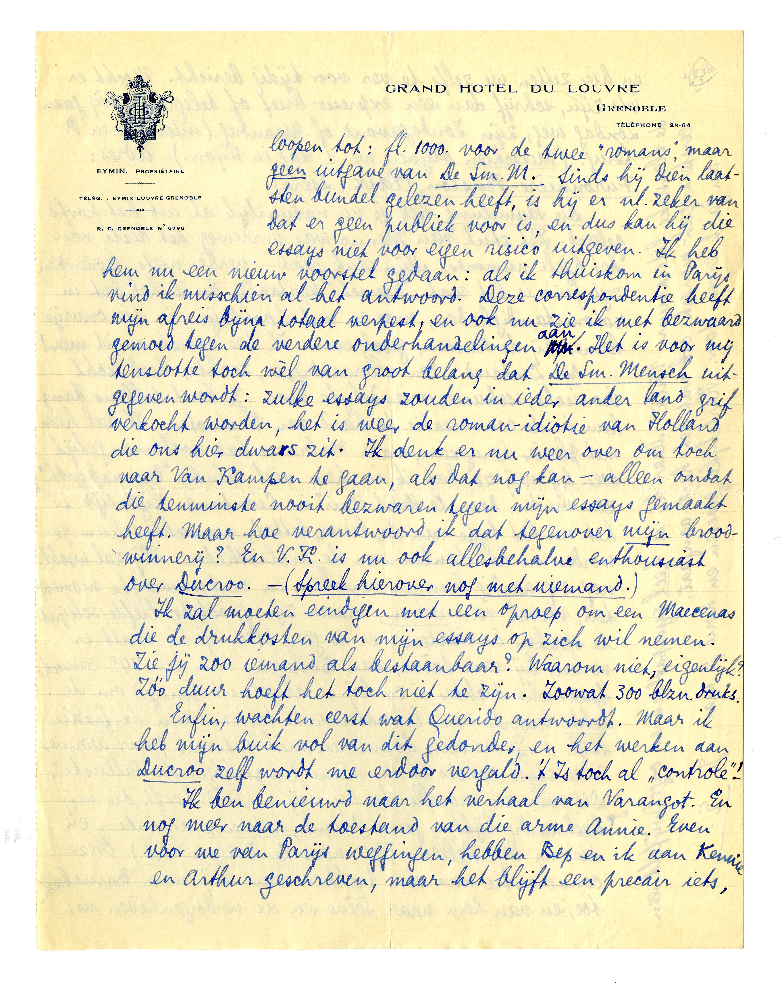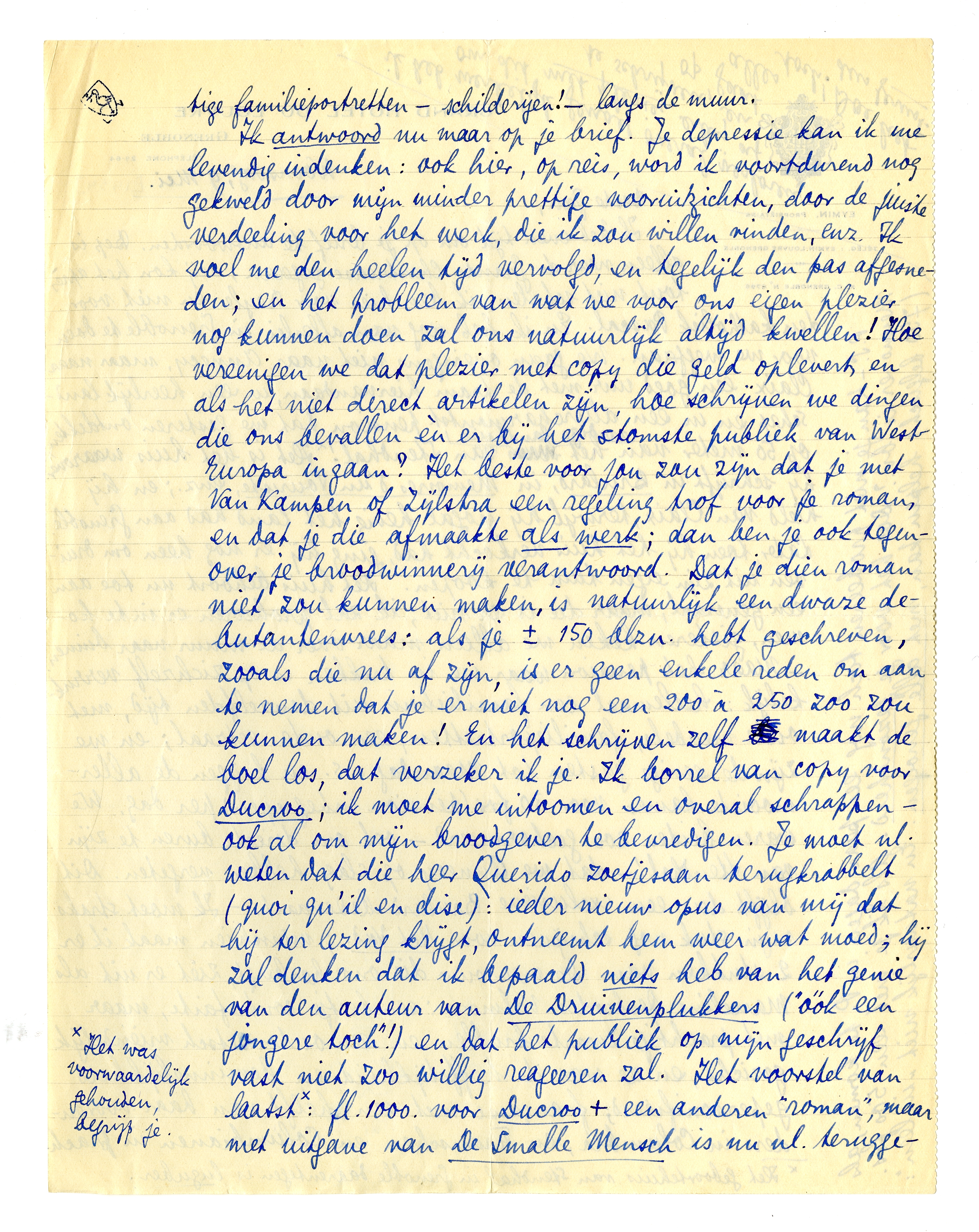 Ik antwoord nu maar op je brief. Je depressie kan ik me levendig indenken: ook hier, op reis, word ik voortdurend nog gekweld door mijn minder prettige vooruitzichten, door de juiste verdeeling voor het werk, die ik zou willen vinden, enz. Ik voel me den heelen tijd vervolgd, en tegelijk den pas afgesneden; en het probleem van wat we voor ons eigen plezier nog kunnen doen zal ons natuurlijk altijd kwellen! Hoe vereenigen we dat plezier met copy die geld oplevert, en als het niet direct artikelen zijn, hoe schrijven we dingen die ons bevallen èn er bij het stomste publiek van West-Europa ingaan? Het beste voor jou zou zijn dat je met Van Kampen of Zijlstra een regeling trof voor je roman, en dat je die afmaakte als werk; dan ben je ook tegenover je broodwinnerij verantwoord. Dat je dien roman niet zou kunnen maken, is natuurlijk een dwaze debutanten vrees: als je ± 150 blzn. hebt geschreven, zooals die nu af zijn, is er geen enkele reden om aan te nemen dat je er niet nog een 200 à 250 zoo zou kunnen maken! En het schrijven zelf maakt de boel los, dat verzeker ik je. Ik borrel van copy voor Ducroo; ik moet me intoomen en overal schrappen - ook al om mijn broodgever te bevredigen. Je moet nl. weten dat die heer Querido zoetjesaan terugkrabbelt (quoi qu'il en dise): ieder nieuw opus van mij dat hij ter lezing krijgt, ontneemt hem weer wat moed; hij zal denken dat ik bepaald niets heb van het genie van den auteur van De Druivenplukkers (‘óók een jongere toch’!) en dat het publiek op mijn geschrijf vast niet zoo willig reageeren zal. Het voorstel van laatst*: fl.1000. voor Ducroo + een anderen ‘roman’, maar met uitgave van De Smalle Mensch is nu nl. teruggeloopen tot: fl. 1000. voor de twee ‘romans’, maar geen uitgave van De Sm. M. Sinds hij dien laatsten bundel gelezen heeft, is hij er nl. zeker van dat er geen publiek voor is, en dus kan hij die essays niet voor eigen risico uitgeven. Ik heb hem nu een nieuw voorstel gedaan: als ik thuiskom in Parijs vind ik misschien al het antwoord. Deze correspondentie heeft mijn afreis bijna totaal verpest, en ook nu zie ik met bezwaard gemoed tegen de verdere onderhandelingen aan. Het is voor mij tenslotte toch wèl van groot belang dat De Sm. Mensch uitgegeven wordt: zulke essays zouden in ieder ander land grif verkocht worden, het is weer de roman-idiotie van Holland die ons hier dwars zit. Ik denk er nu weer over om toch naar Van Kampen te gaan, als dat nog kan - alleen omdat die tenminste nooit bezwaren tegen mijn essays gemaakt heeft. Maar hoe verantwoord ik dat tegenover mijn broodwinnerij? En V.K. is nu ook allesbehalve enthousiast over Ducroo. - (Spreek hierover nog met niemand.)