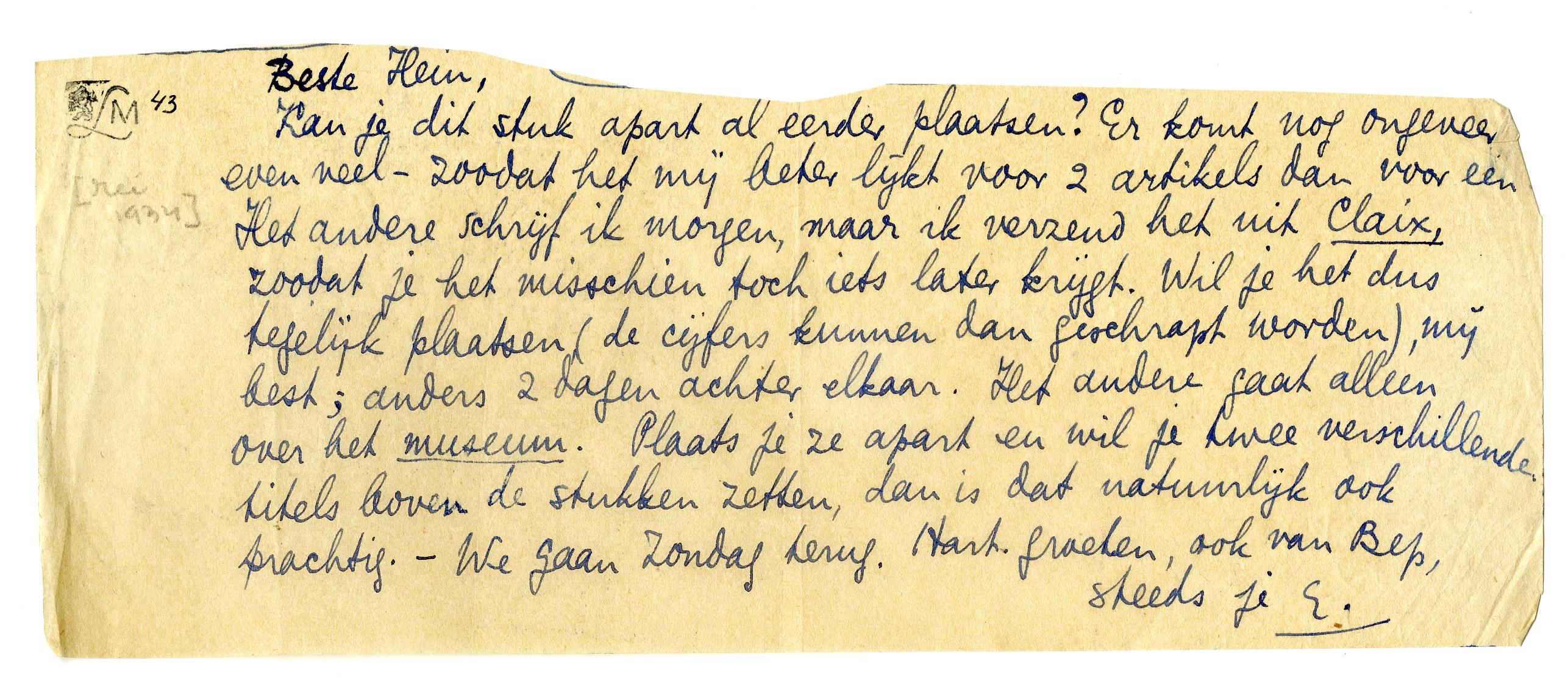 Kan je dit stuk apart al eerder plaatsen? Er komt nog ongeveer even veel - zoodat het mij beter lijkt voor 2 artikels dan voor een. Het andere schrijf ik morgen, maar ik verzend het uit Claix, zoodat je het misschien toch iets later krijgt. Wil je het dus tegelijk plaatsen (de cijfers kunnen dan geschrapt worden), mij best; anders 2 dagen achter elkaar. Het andere gaat alleen over het museum. Plaats je ze apart en wil je twee verschillende titels boven de stukken zetten, dan is dat natuurlijk ook prachtig. - We gaan Zondag terug. Hart. groeten, ook van Bep,
