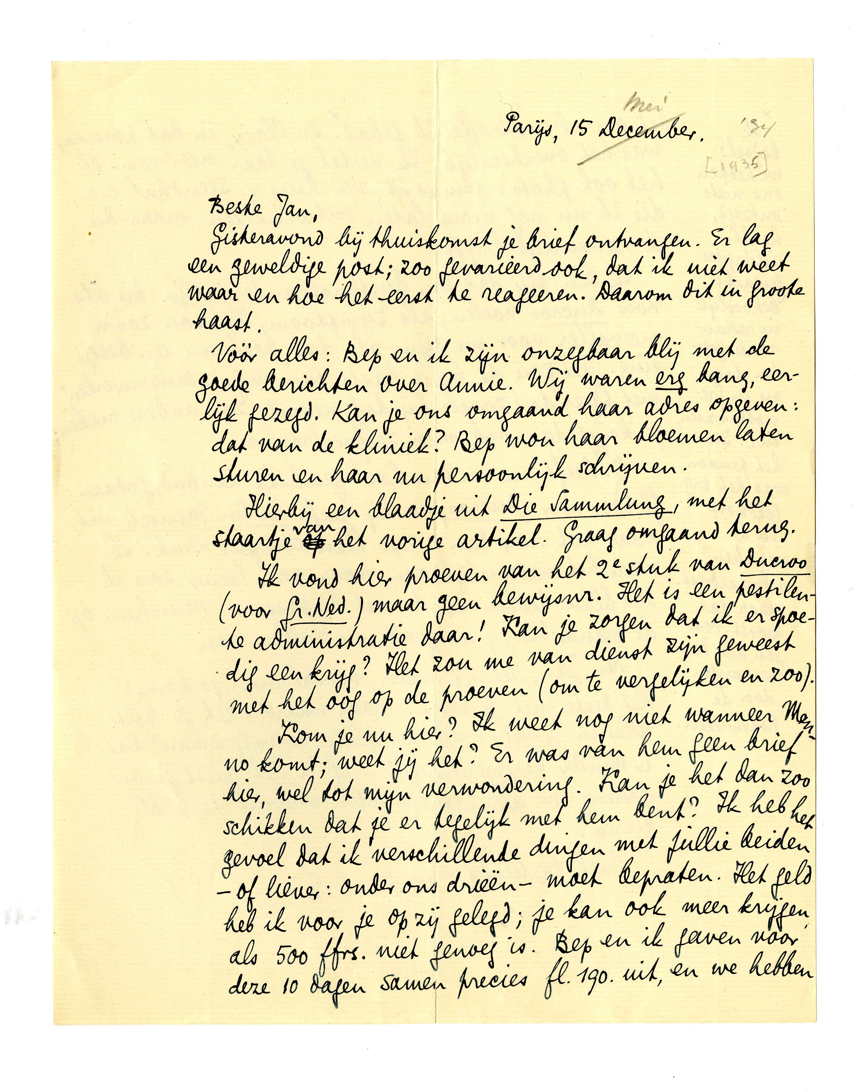 Vóór alles: Bep en ik zijn onzegbaar blij met de goede berichten over Annie. Wij waren erg bang, eerlijk gezegd. Kan je ons omgaand haar adres opgeven: dat van de kliniek? Bep wou haar bloemen laten sturen en haar nu persoonlijk schrijven.