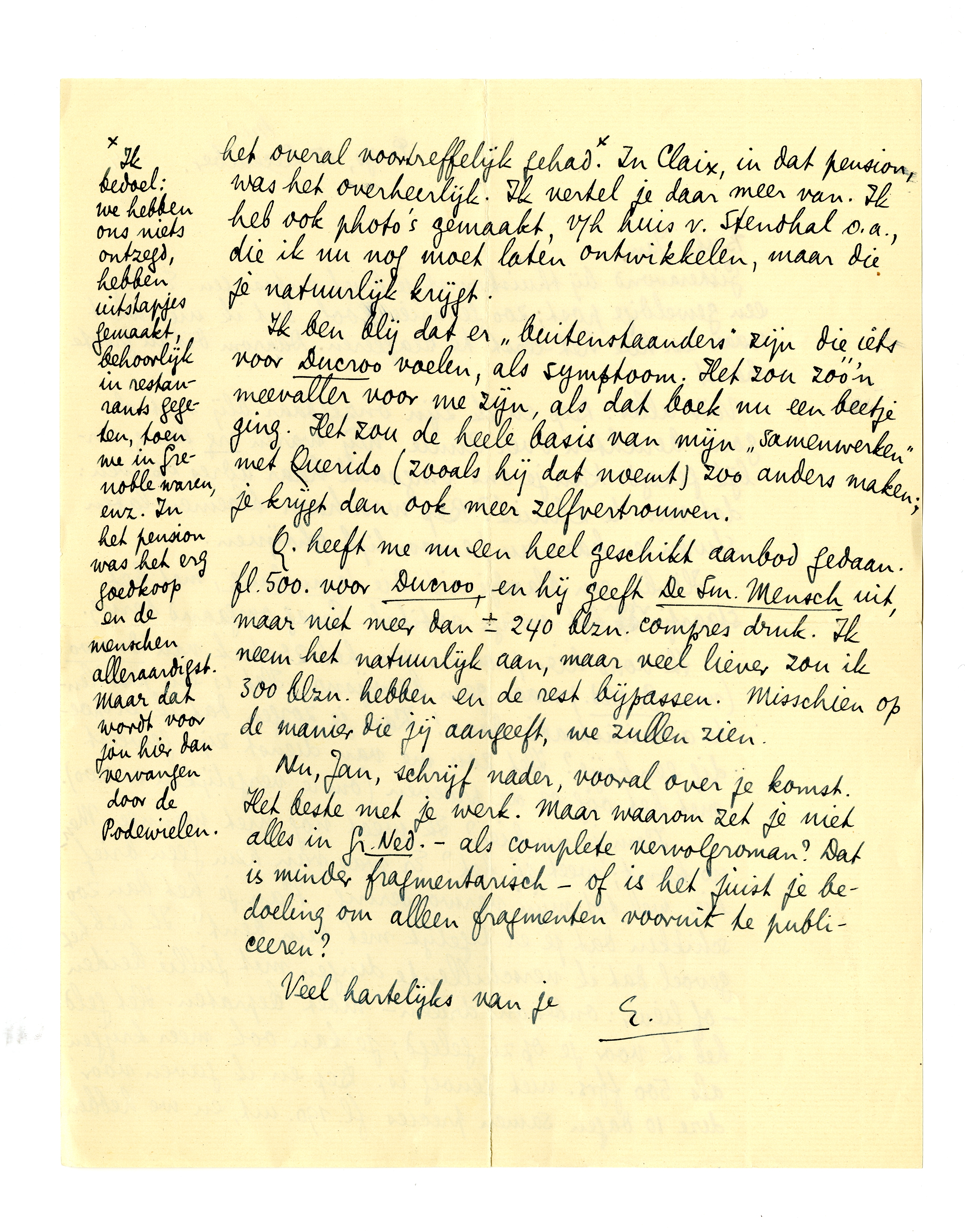 Nu, Jan, schrijf nader, vooral over je komst. Het beste met je werk. Maar waarom zet je niet alles in Gr. Ned. - als complete vervolgroman? Dat is minder fragmentarisch - of is het juist je bedoeling om alleen fragmenten vooruit te publiceeren?