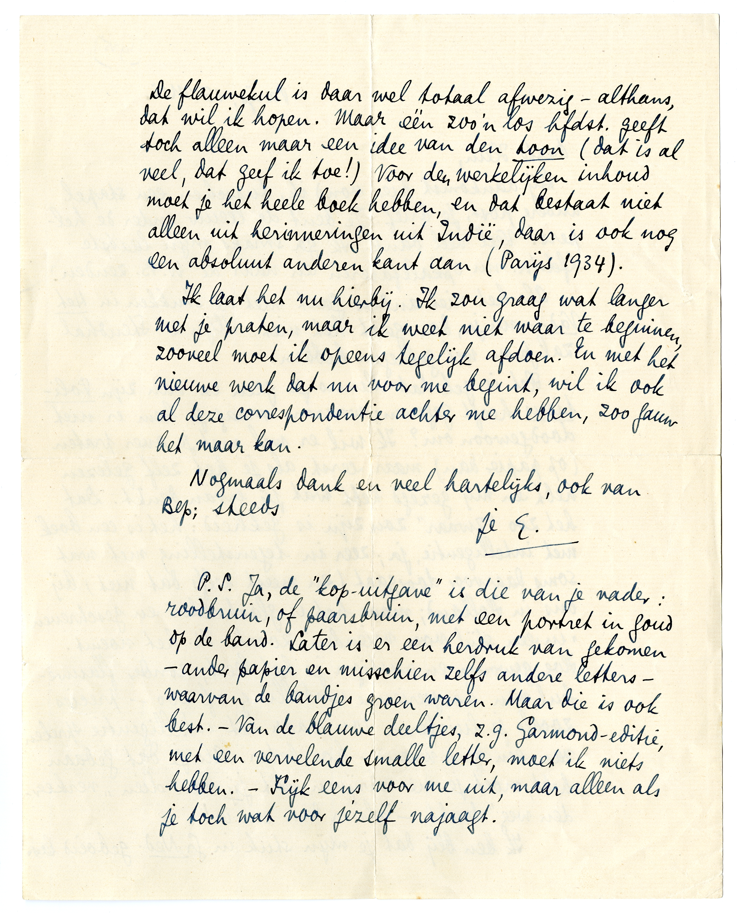Ik ben blij dat je mijn stuk in Gr.Ned. geboeid las. De flauwekul is daar wel totaal afwezig - althans, dat wil ik hopen. Maar één zoo'n los hfdst. geeft toch alleen maar een idee van den toon (dat is al veel, dat geef ik toe!) Voor den werkelijken inhoud moet je het heele boek hebben, en dat bestaat niet alleen uit herinneringen uit Indië, daar is ook nog een absoluut anderen kant aan (Parijs 1934).