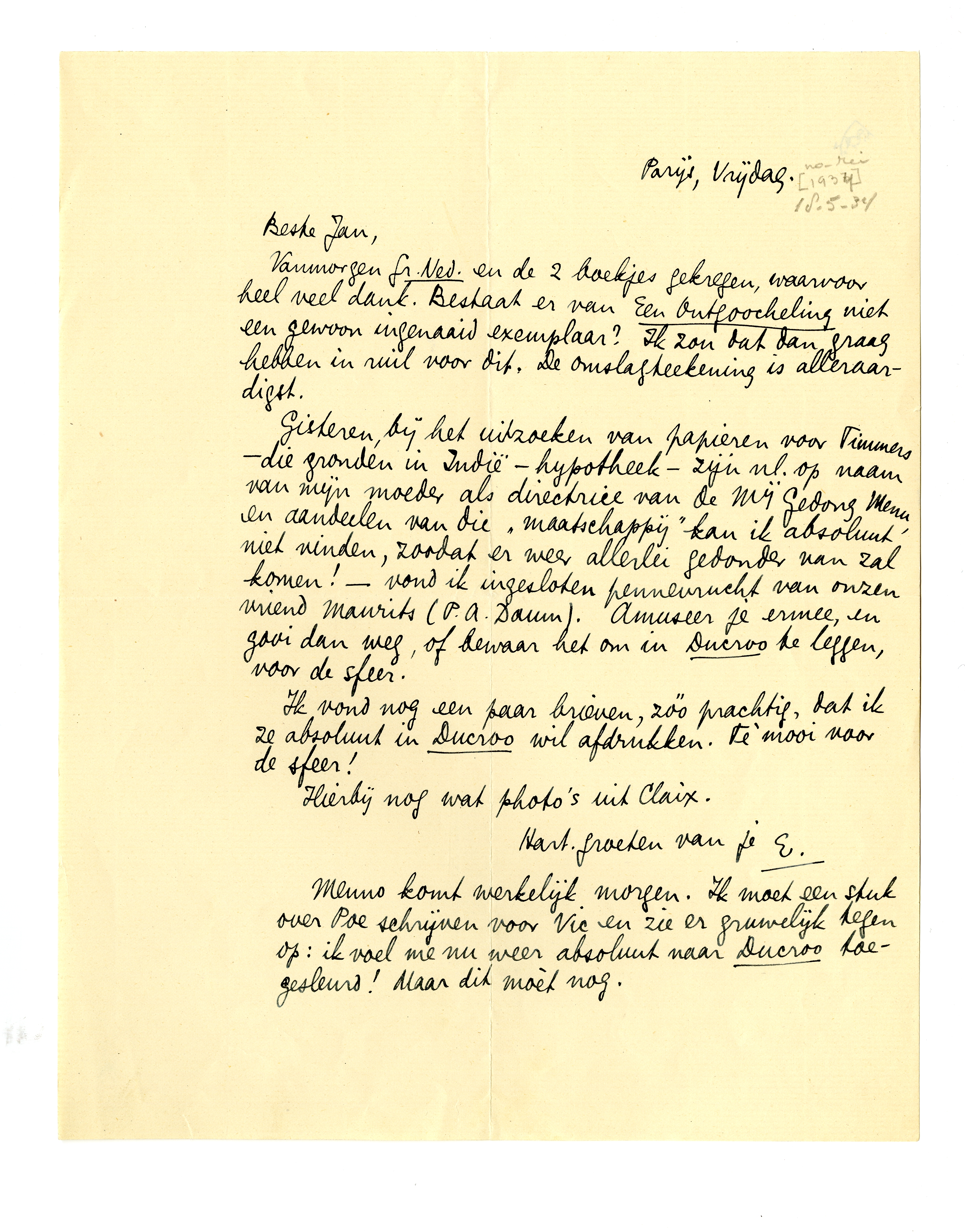 Gisteren, bij het uitzoeken van papieren voor Timmers - die gronden in Indië - hypotheek - zijn nl. op naam van mijn moeder als directrice van de Mij Gedong Menu, en aandeelen van die ‘maatschappij’ kan ik absoluut niet vinden, zoodat er weer allerlei gedonder van zal komen! - vond ik ingesloten pennevrucht van onzen vriend Maurits (P.A. Daum).3215 Amuseer je ermee, en gooi dan weg, of bewaar het om in Ducroo te leggen, voor de sfeer.