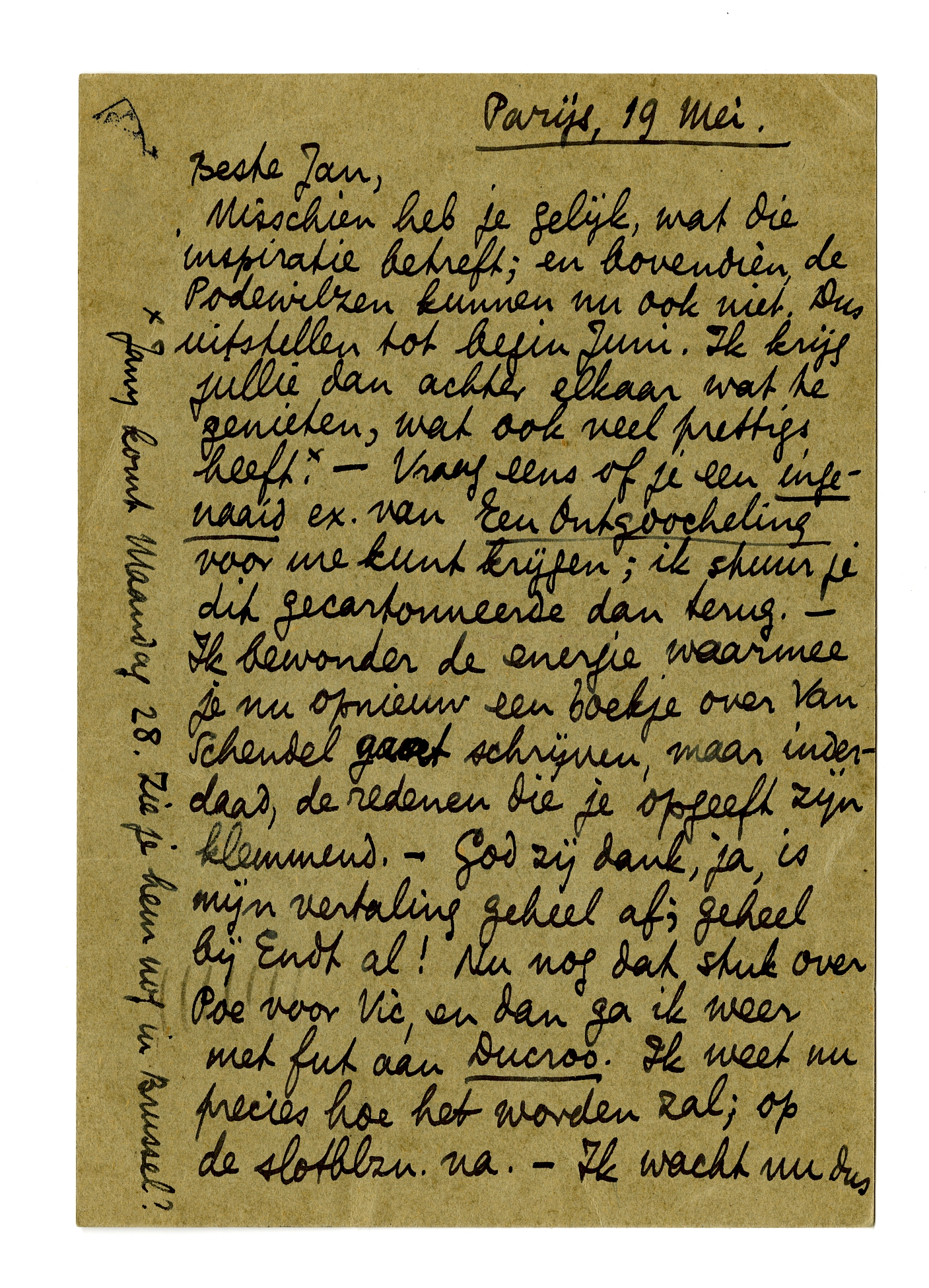 Misschien heb je gelijk, wat die inspiratie betreft; en bovendien, de Podewilzen kunnen nu ook niet. Dus uitstellen tot begin Juni. Ik krijg jullie dan achter elkaar wat te genieten, wat ook veel prettigs heeft.* - Vraag eens of je een ingenaaid ex. van Een Ontgoocheling voor me kunt krijgen; ik stuur je dit gecartonneerde dan terug. - Ik bewonder de energie waarmee je nu opnieuw een boekje over Van Schendel gaat schrijven,3218 maar inderdaad, de redenen die je opgeeft zijn klemmend. - God zij dank, ja, is mijn vertaling geheel af; geheel bij Endt al! Nu nog dat stuk over Poe voor Vic, en dan ga ik weer met fut aan Ducroo. Ik weet nu precies hoe het worden zal; op de slotblzn. na. - Ik wacht nu dus op bericht van je uit Holland, of na je terugkeer, over dat 3e stuk Ducroo in Gr.Ned.: hoè idioot F.C. ook geworden mag zijn, misschien is er toch kans om hem op gezag te laten aannemen dat Ducroo nog wel wat ‘belangrijker’ is (mooi woord van de Holl. kritiek) dan Anneke van Eva en Johanna van Jef.3219 Wàt een flauwekul, zoowel het eene als het andere! Enfin - basta. Hartelijk je