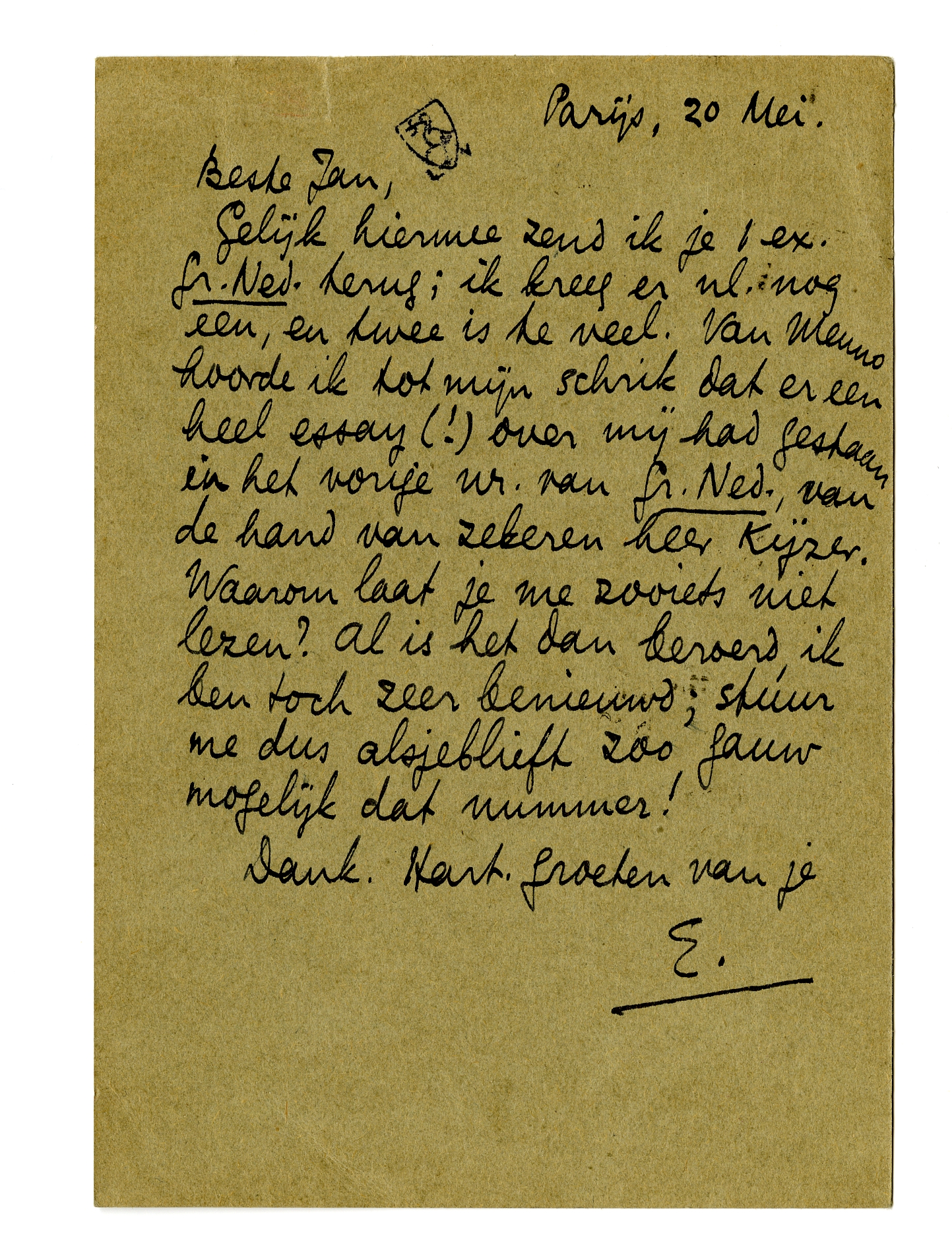 Gelijk hiermee zend ik je 1 ex. Gr.Ned. terug; ik kreeg er nl. nog een, en twee is te veel. Van Menno hoorde ik tot mijn schrik dat er een heel essay(!) over mij had gestaan in het vorige nr. van Gr.Ned., van de hand van zekeren heer Kijzer.3220 Waarom laat je me zooiets niet lezen? Al is het dan beroerd, ik ben toch zeer benieuwd; stuur me dus alsjeblieft zoo gauw mogelijk dat nummer!