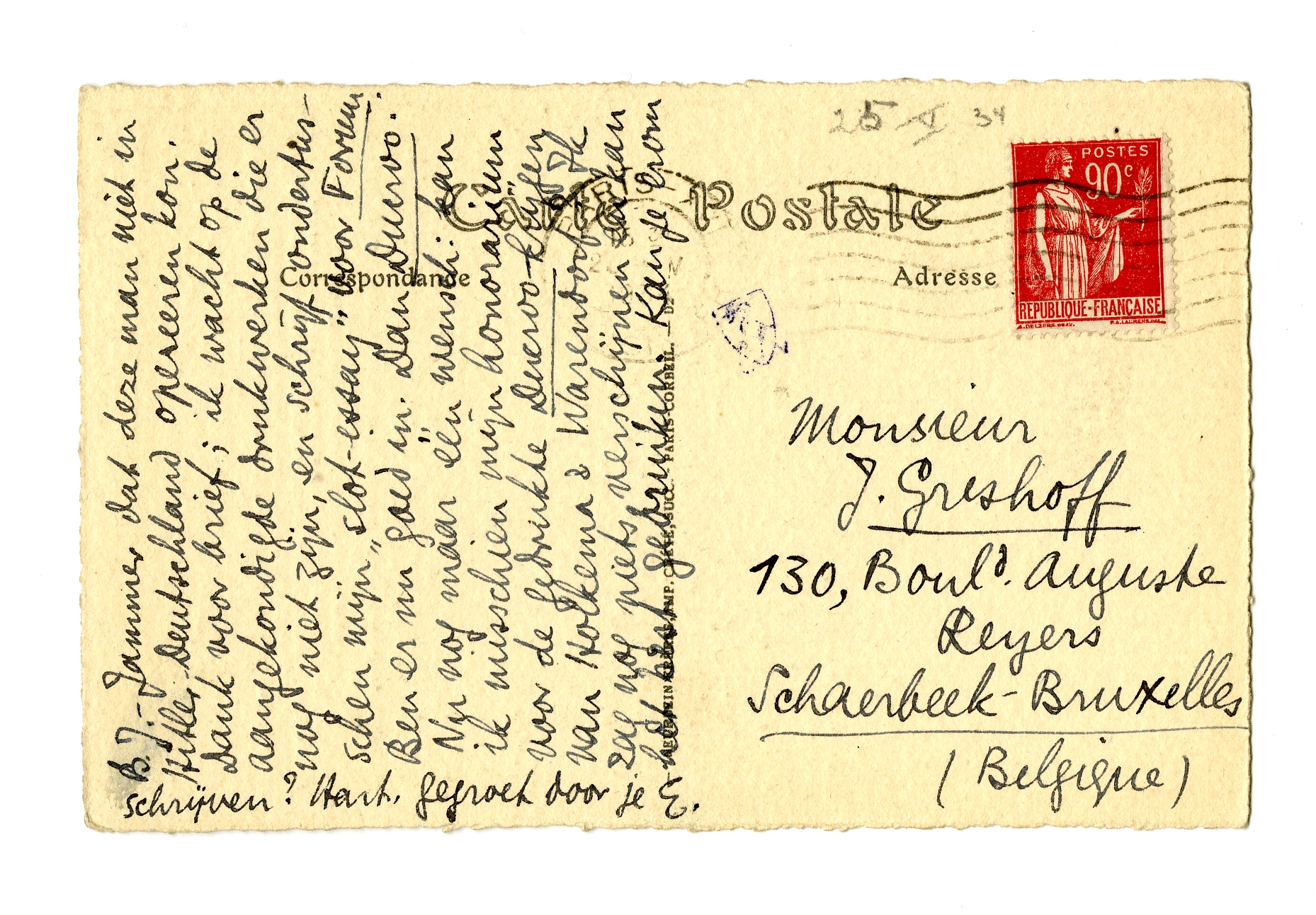 B.J. - Jammer dat deze man niet in Hitler-Deutschland opereeren kon. Dank voor brief; ik wacht op de aangekondigde drukwerken die er nog niet zijn, en schrijf ondertusschen mijn ‘slot-essay’ voor Forum.3226 Ben er nu goed in. Dan Ducroo. Nu nog maar één wensch: kan ik misschien mijn honorarium voor de gedrukte Ducroo krijgen van Holkema & Warendorf? Ik zag nog niets verschijnen en kan het best gebruiken. Kan je erom schrijven? Hart. gegroet door je
