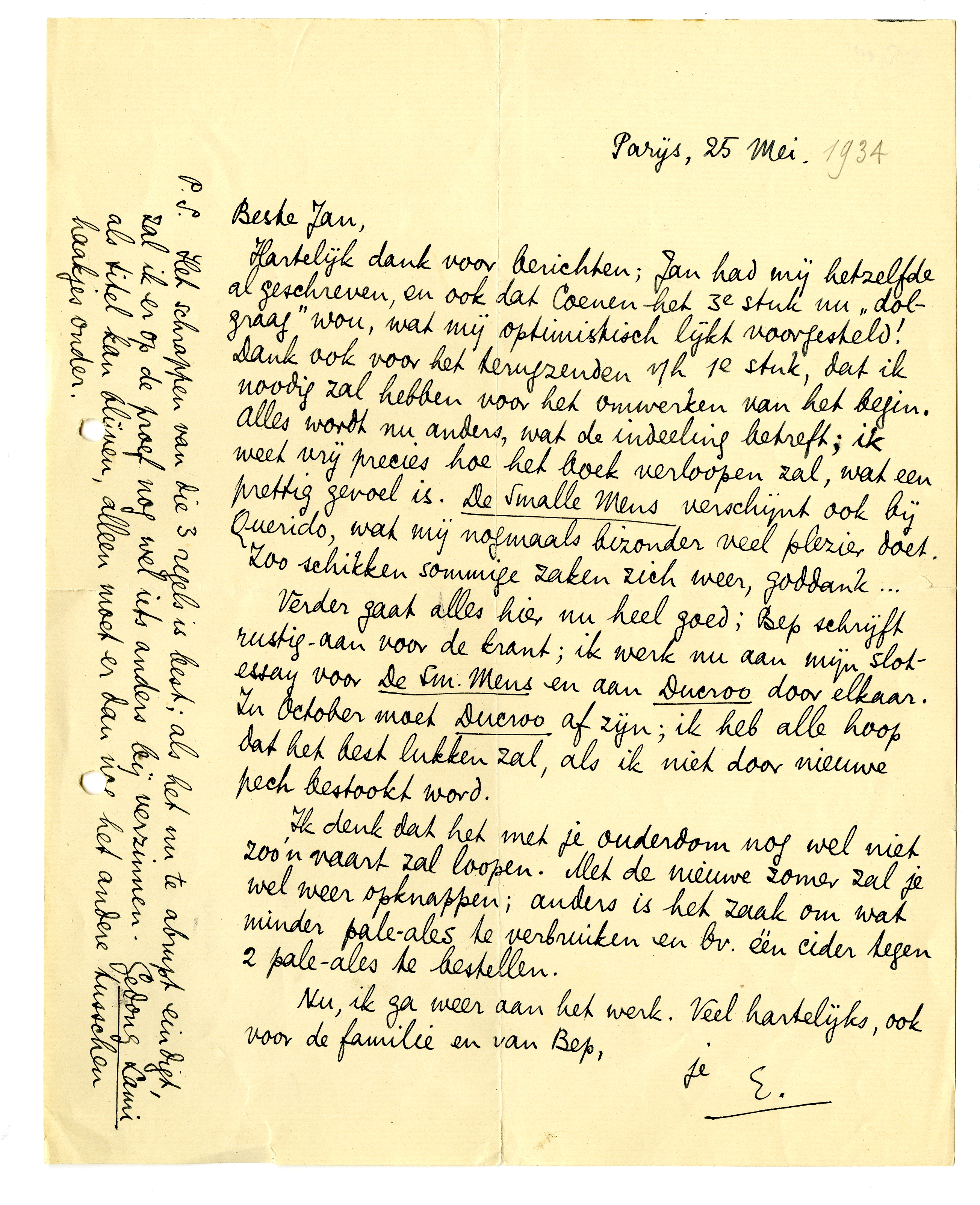 Hartelijk dank voor berichten; Jan had mij hetzelfde al geschreven, en ook dat Coenen het 3e stuk nu ‘dolgraag’ wou, wat mij optimistisch lijkt voorgesteld! Dank ook voor het terugzenden v/h 1e stuk, dat ik noodig zal hebben voor het omwerken van het begin. Alles wordt nu anders, wat de indeeling betreft; ik weet vrij precies hoe het boek verloopen zal, wat een prettig gevoel is. De Smalle Mens verschijnt ook bij Querido, wat mij nogmaals bizonder veel plezier doet. Zoo schikken sommige zaken zich weer, goddank ...