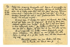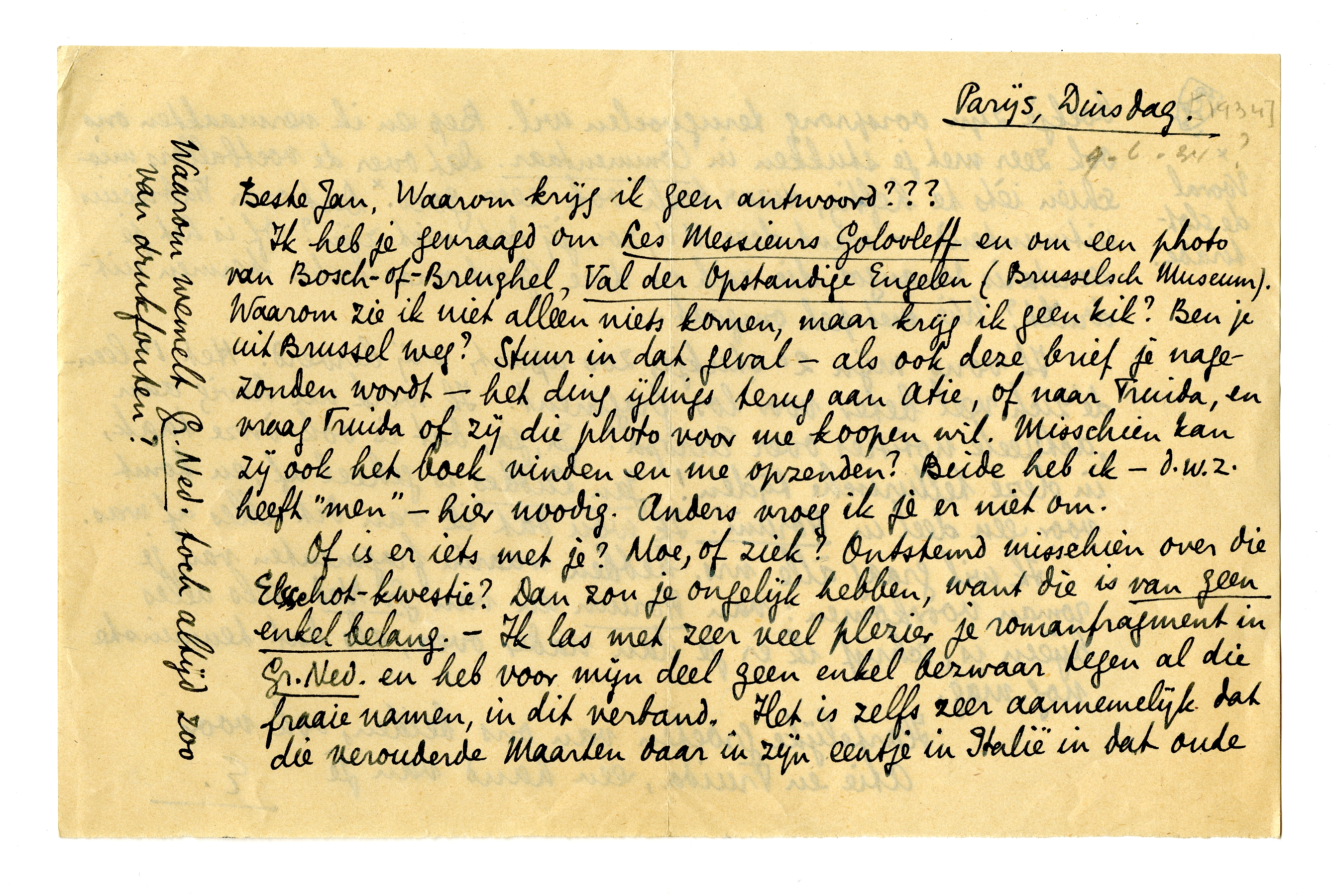 Ik heb je gevraagd om Les Messieurs Golovleff en om een photo van Bosch-of-Breughel, Val der Opstandige Engelen (Brusselsch Museum). Waarom zie ik niet alleen niets komen, maar krijg ik geen kik? Ben je uit Brussel weg? Stuur in dat geval - als ook deze brief je nagezonden wordt - het ding ijlings terug aan Atie, of naar Truida, en vraag Truida of zij die photo voor me koopen wil. Misschien kan zij ook het boek vinden en me opzenden? Beide heb ik - d.w.z. heeft ‘men’ - hier noodig. Anders vroeg ik je er niet om.