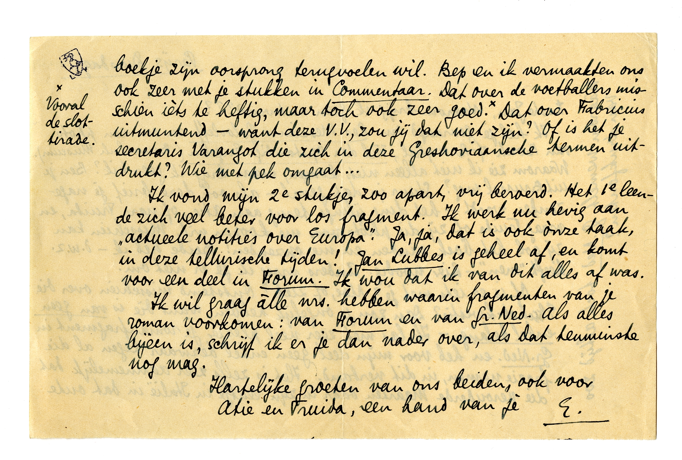 Of is er iets met je? Moe, of ziek? Ontstemd misschien over die Elsschotkwestie? Dan zou je ongelijk hebben, want die is van geen enkel belang. - Ik las met zeer veel plezier je romanfragment in Gr.Ned.3245 en heb voor mijn deel geen enkel bezwaar tegen al die fraaie namen, in dit verband. Het is zelfs zeer aannemelijk dat die verouderde Maarten daar in zijn eentje in Italië in dat oude boekje zijn oorsprong terugvoelen wil. Bep en ik vermaakten ons ook zeer met je stukken in Commentaar.3246 Dat over de voetballers misschien ièts te heftig, maar toch ook zeer goed.* Dat over Fabricius3247 uitmuntend - want deze V.V., zou jij dat niet zijn? Of is het je secretaris Varangot die zich in deze Greshoviaansche termen uitdrukt? Wie met pek omgaat...
