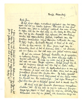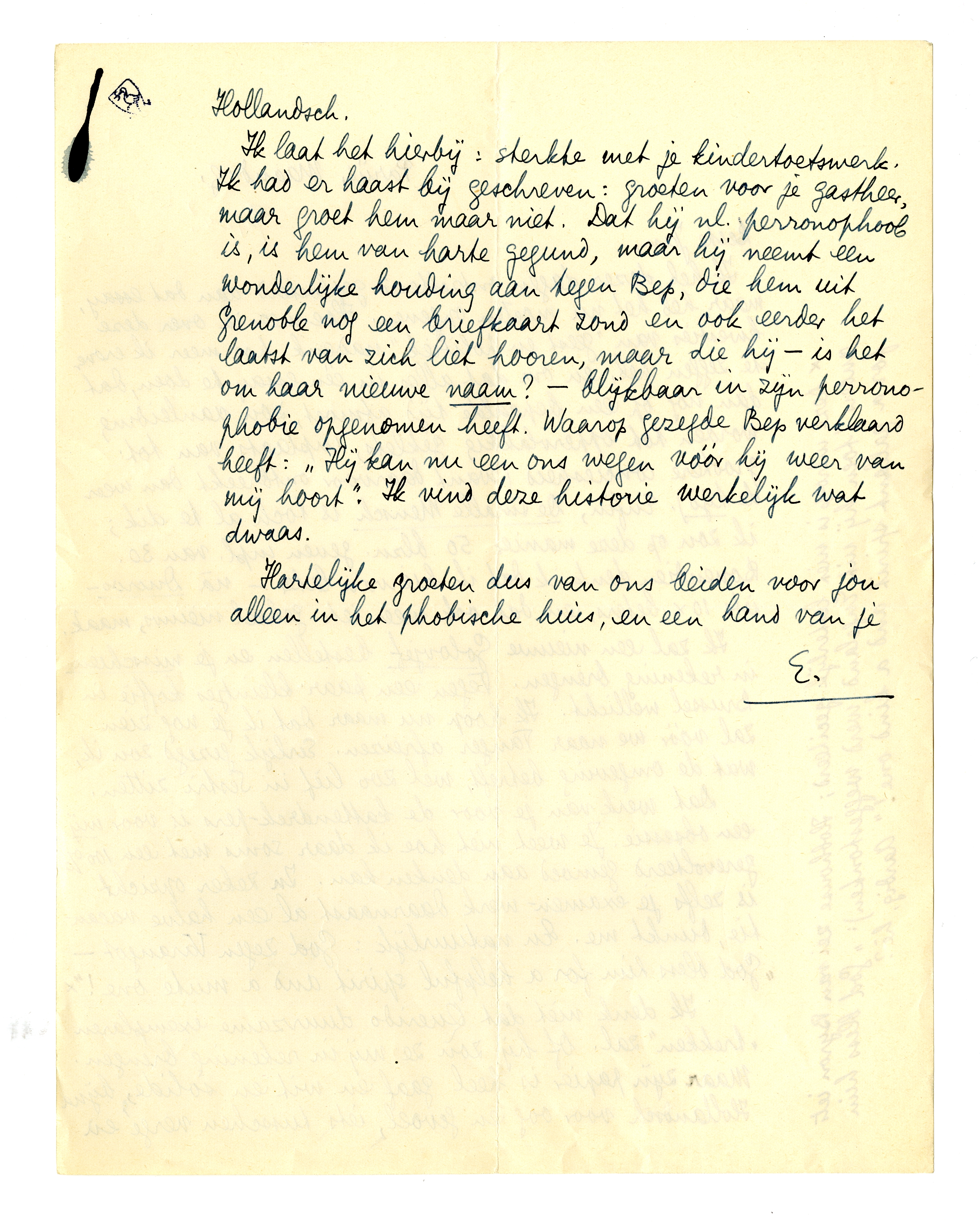Ik laat het hierbij: sterkte met je kindertoetswerk. Ik had er haast bij geschreven: groeten voor je gastheer,3252 maar groet hem maar niet. Dat hij nl. perronophoob is, is hem van harte gegund, maar hij neemt een wonderlijke houding aan tegen Bep, die hem uit Grenoble nog een briefkaart zond en ook eerder het laatst van zich liet hooren, maar die hij - is het om haar nieuwe naam? - blijkbaar in zijn perronophobie opgenomen heeft. Waarop gezegde Bep verklaard heeft: ‘Hij kan nu een ons wegen vóór hij weer van mij hoort’. Ik vind deze historie werkelijk wat dwaas.