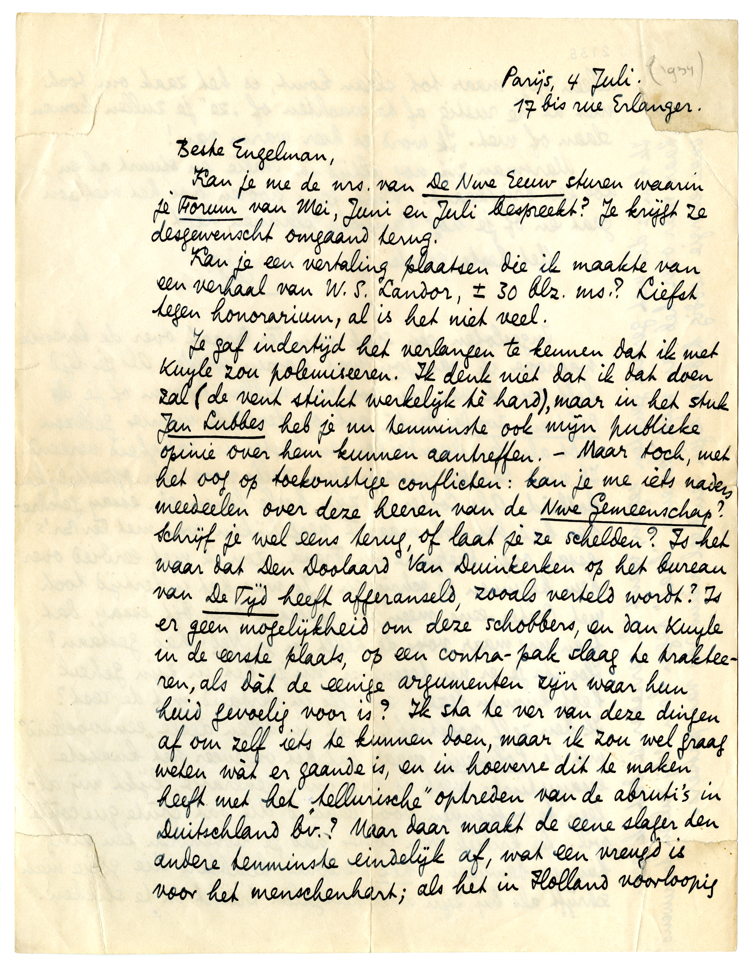 Je gaf indertijd het verlangen te kennen dat ik met Kuyle zou polemiseeren. Ik denk niet dat ik dat doen zal (de vent stinkt werkelijk tè hard), maar in het stuk Jan Lubbes heb je nu tenminste ook mijn publieke opinie over hem kunnen aantreffen. - Maar toch, met het oog op toekomstige conflicten: kan je me iets naders meedeelen over deze heeren van de Nwe Gemeenschap? Schrijf je wel eens terug, of laat je ze schelden?3258 Is het waar dat Den Doolaard Van Duinkerken op het bureau van De Tijd heeft afgeranseld, zooals verteld wordt?3259 Is er geen mogelijkheid om deze schobbers, en dan Kuyle in de eerste plaats, op een contra-pak slaag te trakteeren, als dàt de eenige argumenten zijn waar hun huid gevoelig voor is? Ik sta te ver van deze dingen af om zelf iets te kunnen doen, maar ik zou wel graag weten wàt er gaande is, en in hoeverre dit te maken heeft met het ‘tellurische’ optreden van de abruti's in Duitschland bv.?3260 Maar daar maakt de eene slager den andere tenminste eindelijk af, wat een vreugd is voor het menschenhart; als het in Holland voorloopig alleen nog maar tot slaan komt, is het zaak om toch niet al te rustig af te wachten of ‘ze’ je zullen komen slaan of niet. Ik word er hier warm van!