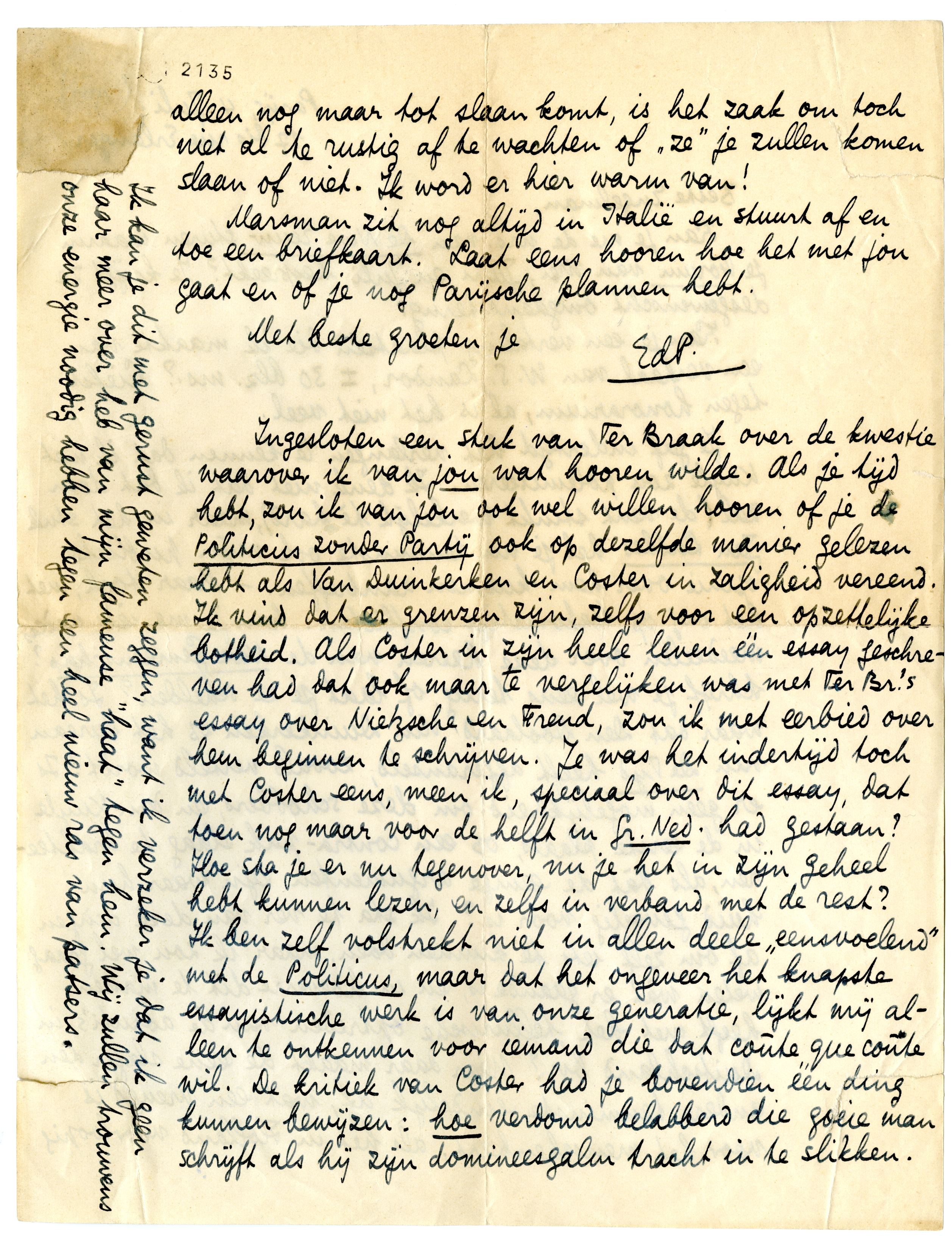 Ingesloten een stuk van Ter Braak over de kwestie waarover ik van jou wat hooren wilde.3261 Als je tijd hebt, zou ik van jou ook wel willen hooren of je de Politicus zonder Partij ook op dezelfde manier gelezen hebt als van Duinkerken en Coster in zaligheid vereend.3262 Ik vind dat er grenzen zijn, zelfs voor een opzettelijke botheid. Als Coster in zijn heele leven één essay geschreven had dat ook maar te vergelijken was met Ter Br.'s essay over Nietzsche en Freud, zou ik met eerbied over hem beginnen te schrijven. Je was het indertijd toch met Coster eens, meen ik, speciaal over dit essay, dat toen nog maar voor de helft in Gr. Ned. had gestaan?3263 Hoe sta je er nu tegenover, nu je het in zijn geheel hebt kunnen lezen, en zelfs in verband met de rest? Ik ben zelf volstrekt niet in allen deele ‘eensvoelend’ met de Politicus, maar dat het ongeveer het knapste essayistische werk is van onze generatie, lijkt mij alleen te ontkennen voor iemand die dat coûte que coûte wil. De kritiek van Coster had je bovendien één ding kunnen bewijzen: hoe verdomd belabberd die goeie man schrijft als hij zijn domineesgalm tracht in te slikken. Ik kan je dit met gerust geweten zeggen, want ik verzeker je dat ik geen haar meer over heb van mijn fameuse ‘haat’ tegen hem. Wij zullen trouwens onze energie noodig hebben tegen een heel nieuw ras van patsers.