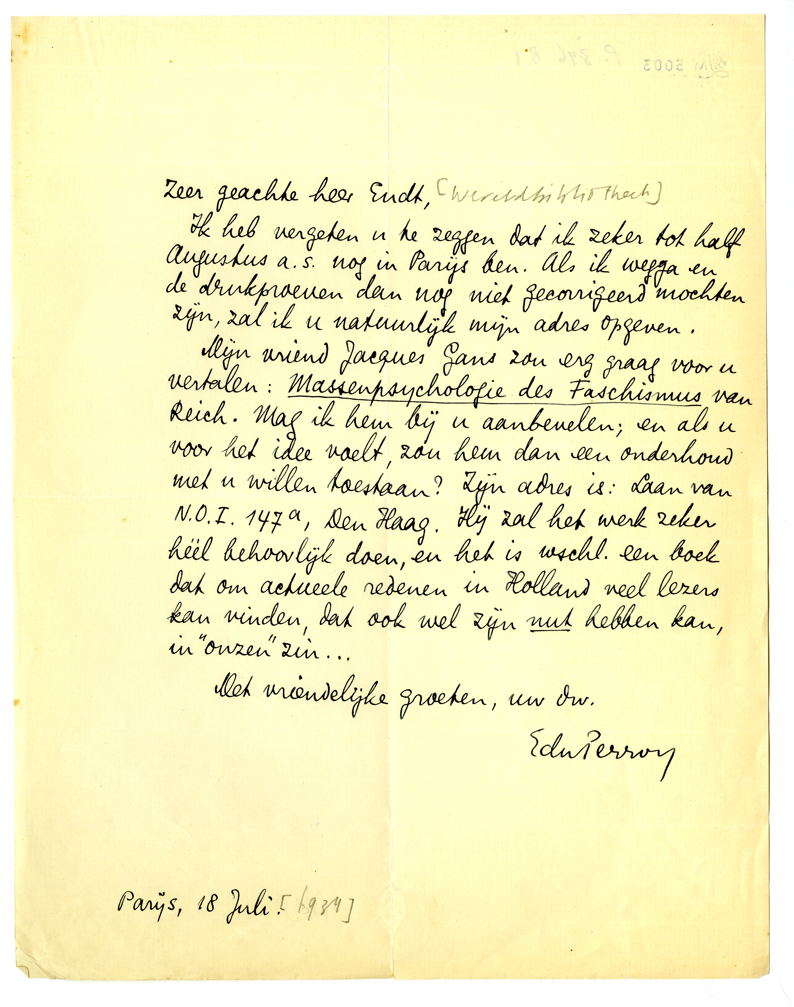 Mijn vriend Jacques Gans zou erg graag voor u vertalen: Massen-psychologie des Faschismus van Reich. Mag ik hem bij u aanbevelen; en als u voor het idee voelt, zou hem dan een onderhoud met u willen toestaan? Zijn adres is: Laan van N.O.I. 147a, Den Haag. Hij zal het werk zeker héél behoorlijk doen, en het is wschl. een boek dat om actueele redenen in Holland veel lezers kan vinden, dat ook wel zijn nut hebben kan, in ‘onzen’ zin.