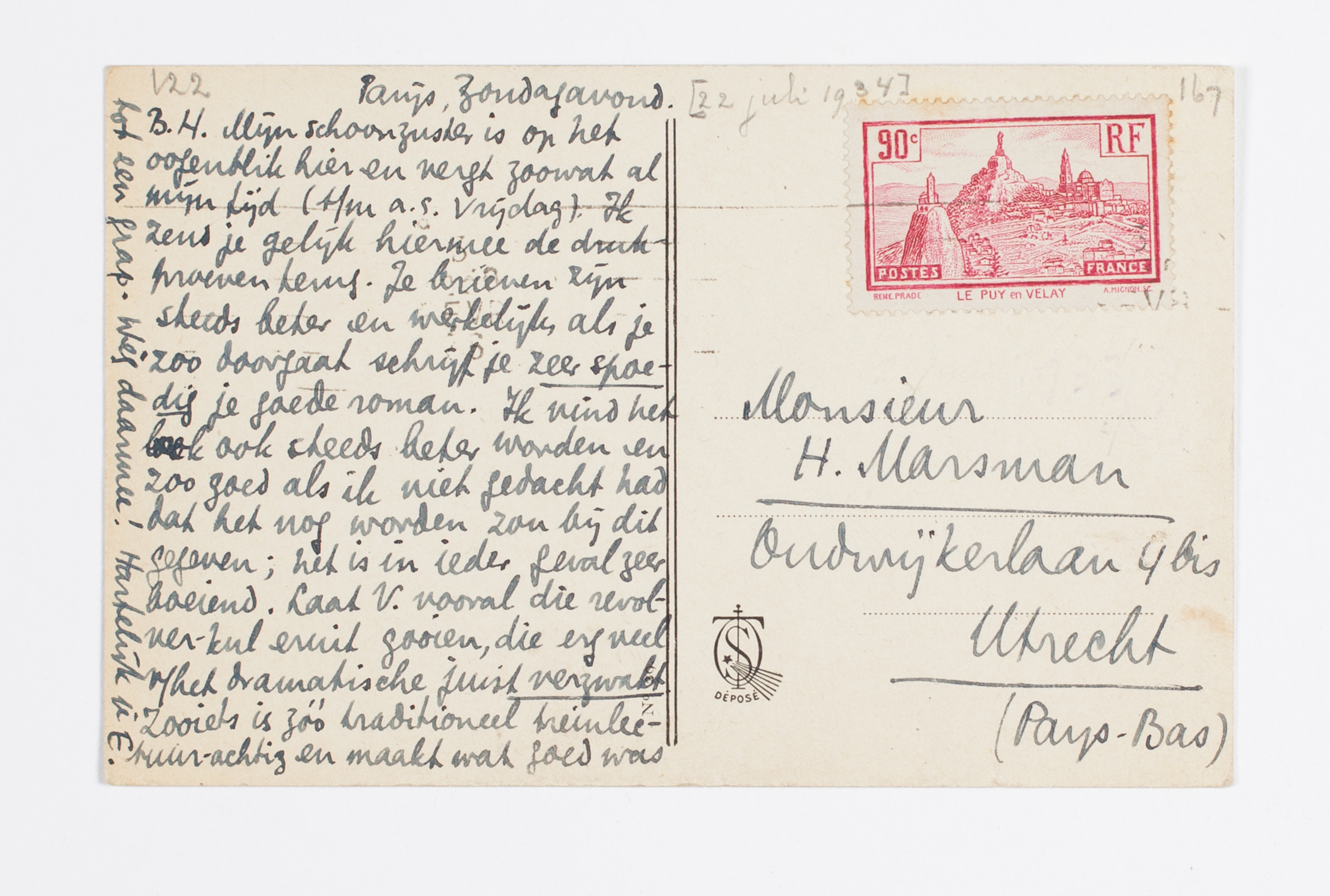 B.H. Mijn schoonzuster is op het oogenblik hier en vergt zoowat al mijn tijd (t/m a.s. Vrijdag). Ik zend je gelijk hiermee de drukproeven terug. Je brieven zijn steeds beter en werkelijk, als je zoo doorgaat schrijf je zeer spoedig je goede roman. Ik vind het boek3290 ook steeds beter worden en zoo goed als ik niet gedacht had dat het nog worden zou bij dit gegeven; het is in ieder geval zeer boeiend. Laat V. vooral die revolver-kul eruit gooien, die erg veel v/het dramatische juist verzwakt. Zooiets is zóó traditioneel treinlectuur-achtig en maakt wat goed was tot een grap. Wèg daarmee! Hartelijk je