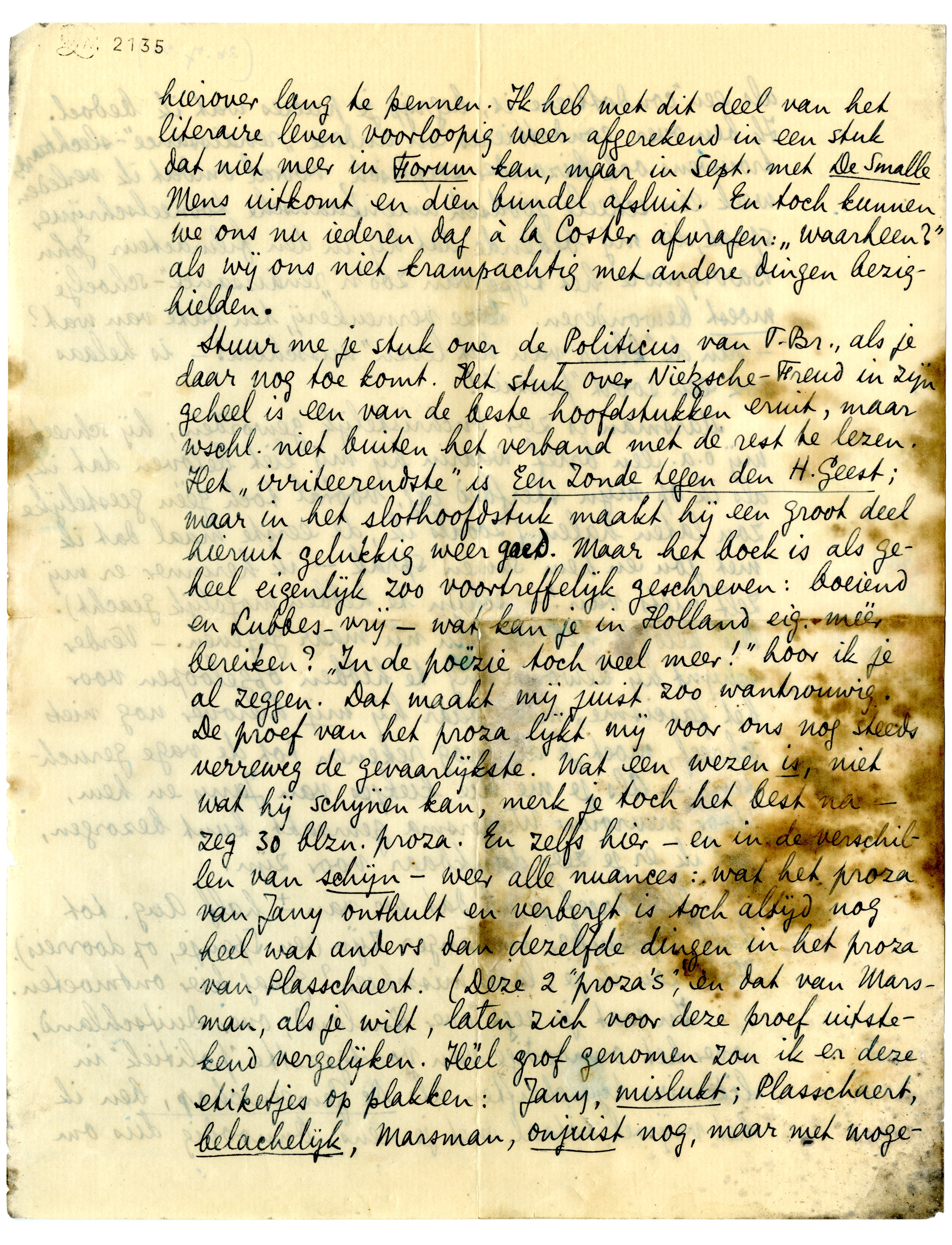 Stuur me je stuk over de Politicus van T. Br.,3299 als je daar nog toe komt. Het stuk over Nietzsche-Freud in zijn geheel is een van de beste hoofdstukken eruit, maar wschl. niet buiten het verband met de rest te lezen. Het ‘irriteerendste’ is Een Zonde tegen den H. Geest; maar in het slothoofdstuk maakt hij een groot deel hieruit gelukkig weer goed. Maar het boek is als geheel eigenlijk zoo voortreffelijk geschreven: boeiend en Lubbes-vrij - wat kan je in Holland eig. méér bereiken? ‘In de poëzie toch veel meer!’ hoor ik je al zeggen. Dat maakt mij juist zoo wantrouwig. De proef van het proza lijkt mij voor ons nog steeds verreweg de gevaarlijkste. Wat een wezen is, niet wat hij schijnen kan, merk je toch het best aan zeg 30 blzn. proza. En zelfs hier - en in de verschillen van schijn - weer alle nuances: wat het proza van Jany onthult en verbergt is toch altijd nog heel wat anders dan dezelfde dingen in het proza van Plasschaert. (Deze 2 ‘proza's’, en dat van Marsman, als je wilt, laten zich voor deze proef uitstekend vergelijken. Héél grof genomen zou ik er deze etiketjes op plakken: Jany, mislukt; Plasschaert, belachelijk, Marsman, onjuist nog, maar met mogelijkheden. Ik bedoel met ‘mislukt’ bij Jany niet, dat het ‘ongekund’ zou zijn - haast het tegendeel; ik bedoel dat er een désaccord is tusschen wat hij voelt en wat hij uitdrukt, zoodra hij in proza schrijft: hij wordt dan als een vogel die met vliegbewegingen loopt. Terwijl Plasschaert een eend is die, hoewel hij niet anders kàn dan loopen, tracht te suggereeren dat ook hij feitelijk een arend is. Marsman zal nog wel leeren loopen als hij koppig blijft. Ik vraag mij alleen maar af waaròm hij dat zoo koppig wil?)