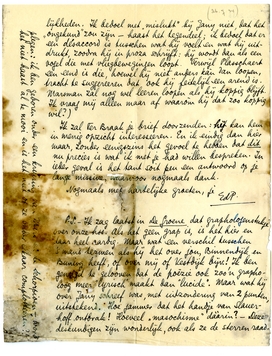 P.S. - Ik zag laatst in De Groene dat graphologenstukje over onze hss.3300 Als het geen grap is, is het hier en daar heel aardig. Maar wat een verschil tusschen 's mans termen als hij het over jou, Binnendijk en Buning heeft, of over mij of Vestdijk bijv.! Ik ben geneigd te gelooven dat de poëzie ook zoo'n grapholoog meer ‘lyrisch’ maakt dan ‘lucide’. Maar wat hij over Jany schreef was, met uitzondering van 2 punten, uitstekend. Hoe jammer dat het handje van Slauerhoff ontbrak! Hoeveel ‘masochisme’ dààrin? - Deze deskundigen zijn wonderlijk, ook als ze de sterren raadplegen: ik ben geboren onder een kruising van Mars en de Schorpioen - wordt het niet haast àl te mooi en is het niet of ze onder elkaar complotteeren?!