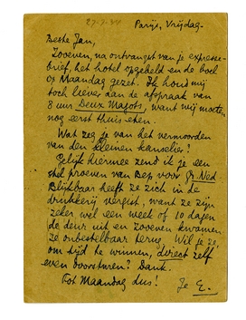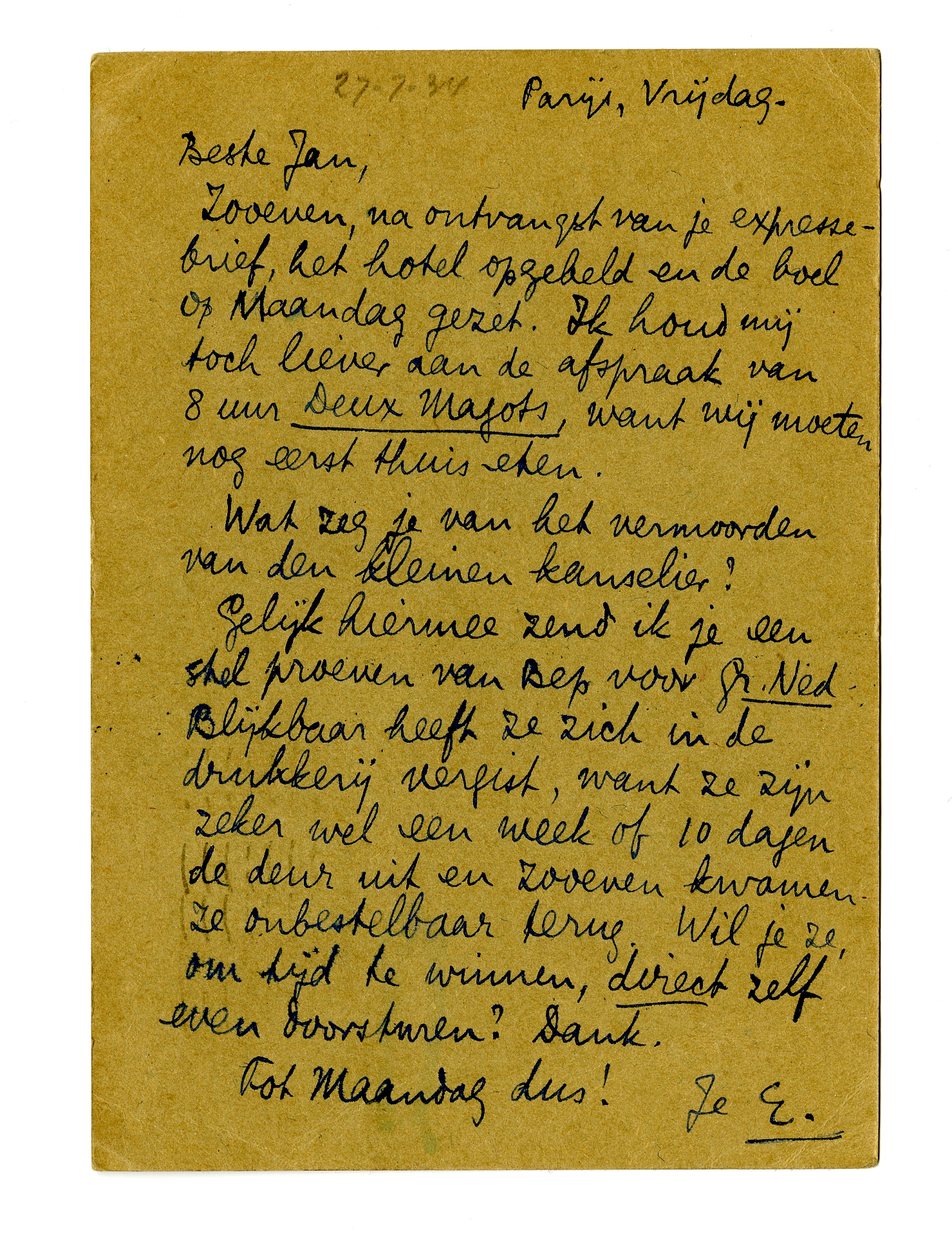 Zooeven, na ontvangst van je expressebrief, het hotel opgebeld en de boel op Maandag gezet. Ik houd mij toch liever aan de afspraak van 8 uur Deux Magots, want wij moeten nog eerst thuis eten.