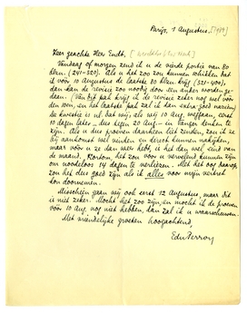 Vandaag of morgen zend ik u de vierde portie van 80 blzn. (241-320). Als u het zoo zou kunnen schikken dat ik vóór 10 Augustus de laatste 80 blzn. krijg (321-400), dan kan de revisie zoo noodig door een ander worden gedaan. (Van dit pak krijg ik de revisie zeker nog wel vóór den 10en, en het laatste pak zal ik dan extra-goed nazien.) De kwestie is nl. dat wij, als wij 10 Aug. weggaan, eerst 10 dagen later - dus tegen 20 Aug. - in Tanger denken te zijn. Als u dus proeven daarheen liet zenden, zou ik ze bij aankomst wel vinden en direct kunnen nakijken, maar vóór u ze dan weer hebt, is het dan wel eind van de maand. Kortom, het zou voor u vervelend kunnen zijn om noodeloos 14 dagen te verliezen. Met het oog daarop, zou het dus goed zijn als ik alles voor mijn vertrek kon doornemen.