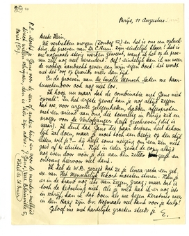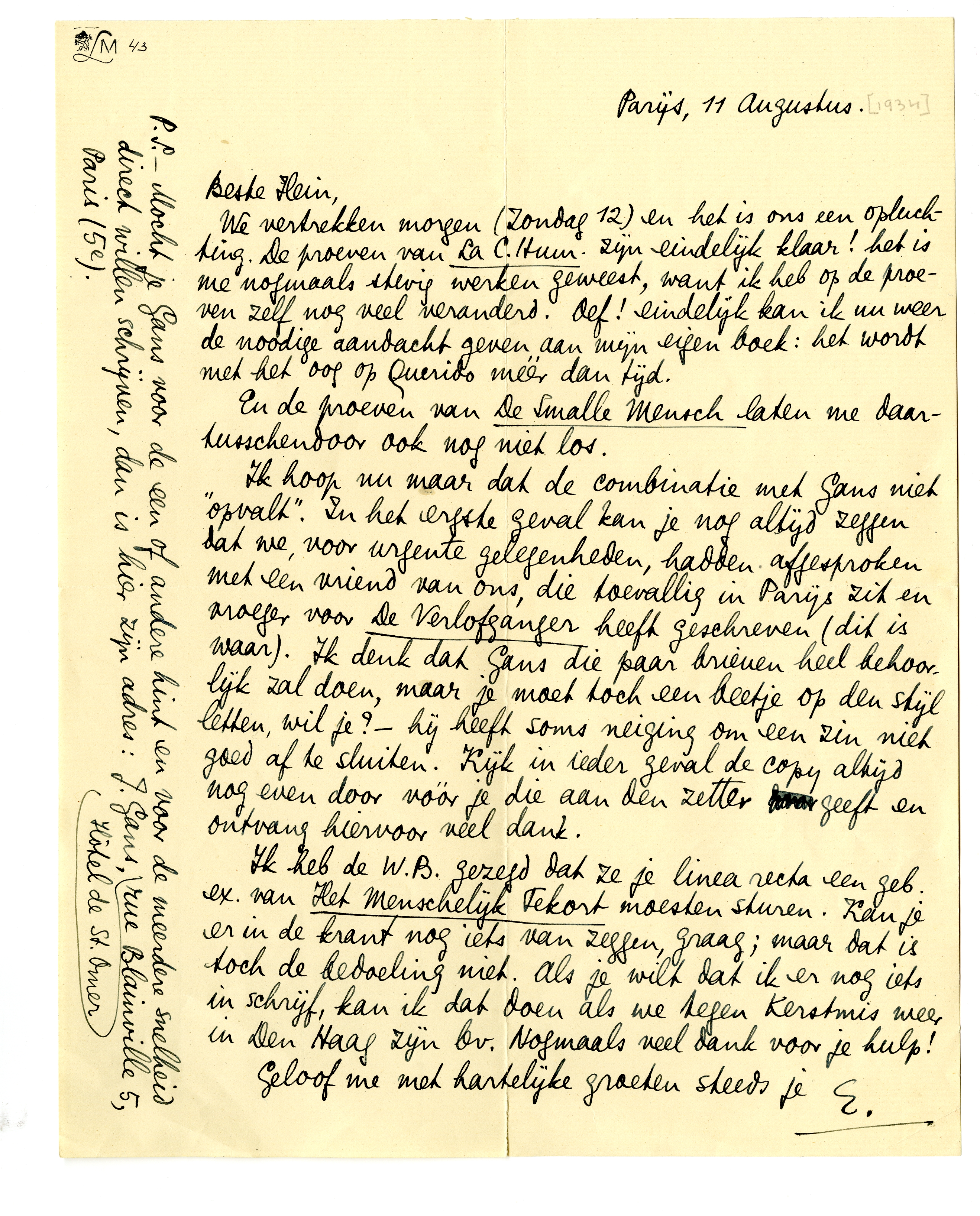 Ik hoop nu maar dat de combinatie met Gans niet ‘opvalt’. In het ergste geval kan je nog altijd zeggen dat we, voor urgente gelegenheden, hadden afgesproken met een vriend van ons,3310 die toevallig in Parijs zit en vroeger voor De Verlofganger heeft geschreven (dit is waar). Ik denk dat Gans die paar brieven heel behoorlijk zal doen, maar je moet toch een beetje op den stijl letten, wil je? - hij heeft soms neiging om een zin niet goed af te sluiten. Kijk in ieder geval de copy altijd nog even door vóór je die aan den zetter geeft en ontvang hiervoor veel dank.