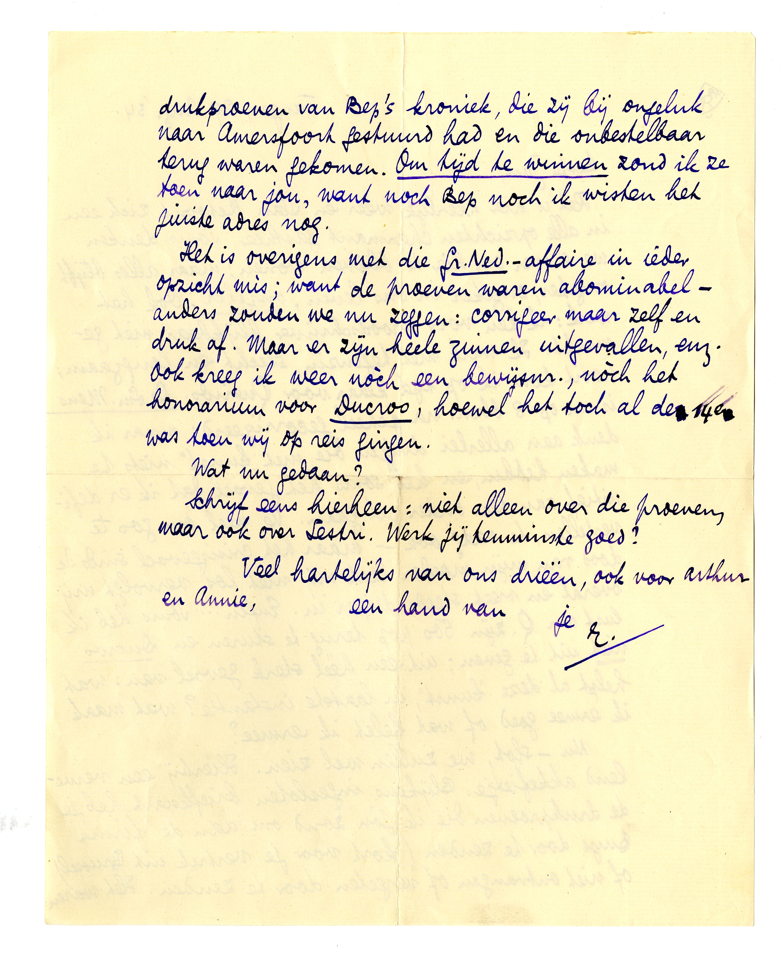 Nu - slot, we zullen wel zien. Hierbij een vervelend akkefietje. Blijkens ingesloten briefkaart heb je de drukproeven die ik jou zond om aan de firma Buys door te zenden (kort voor je vertrek uit Brussel) of niet ontvangen of vergeten door te zenden. Het waren drukproeven van Bep's kroniek, die zij bij ongeluk naar Amersfoort gestuurd had en die onbestelbaar terug waren gekomen. Om tijd te winnen zond ik ze toen naar jou, want noch Bep noch ik wisten het juiste adres nog.