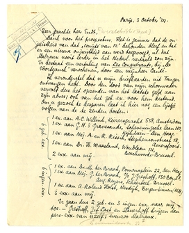Ik veronderstel dat u mijn briefkaarten uit Tanger ontvangen hebt. Door den dood van mijn schoonvader vervalt dus het opzenden van het laatste geld aan zijn adres; ook van het geb. ex. voor hem bestemd. Om u gezoek te besparen laat ik hier nog een lijstje volgen van de te zenden boeken: