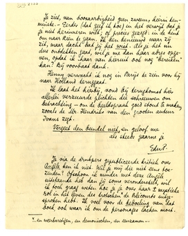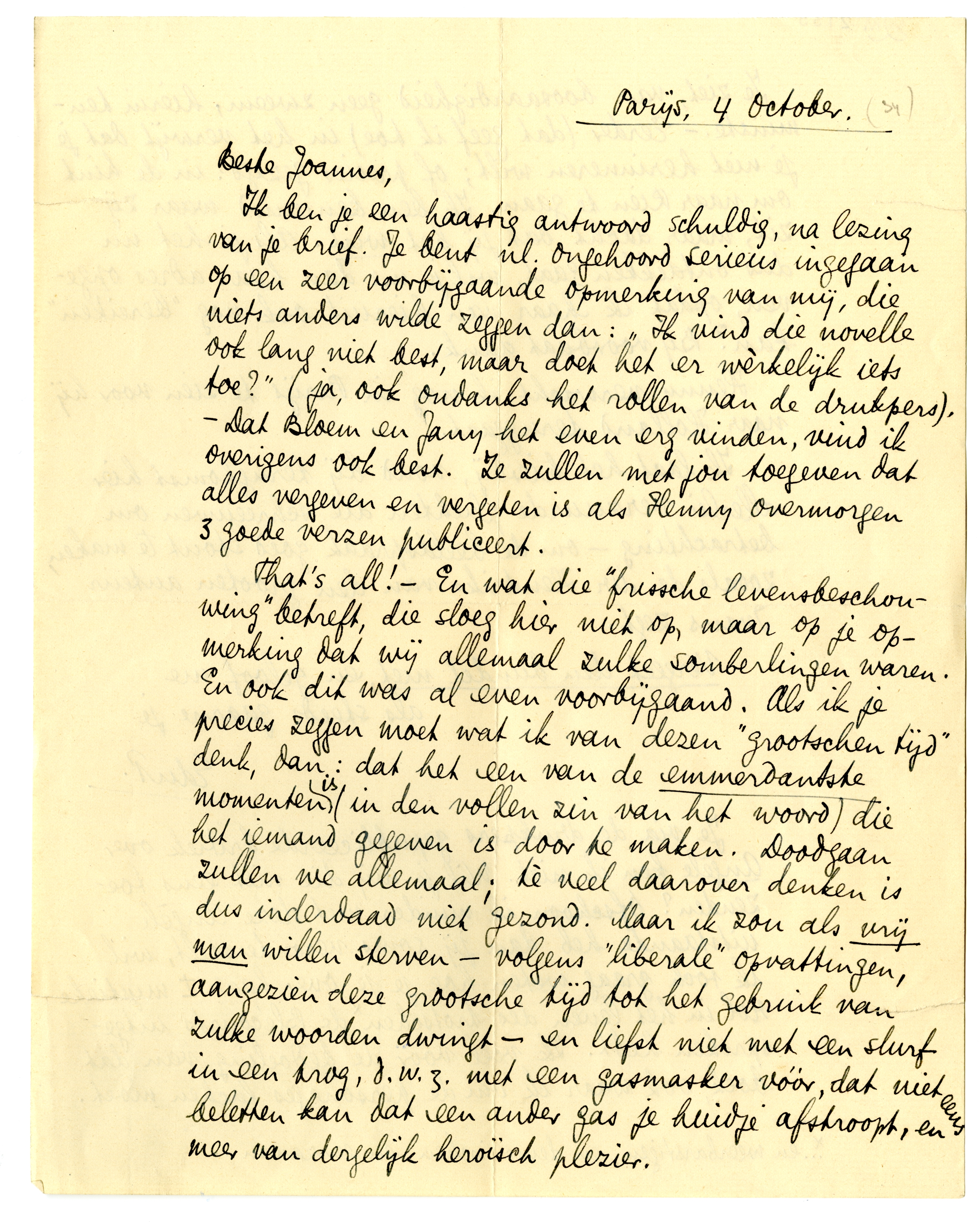 Ik ben je een haastig antwoord schuldig, na lezing van je brief. Je bent nl. ongehoord serieus ingegaan op een zeer voorbijgaande opmerking van mij, die niets anders wilde zeggen dan: ‘Ik vind die novelle ook lang niet best, maar doet het er wèrkelijk iets toe?’ (ja, ook ondanks het rollen van de drukpers). - Dat Bloem en Jany het even erg vinden, vind ik overigens ook best. Ze zullen met jou toegeven dat alles vergeven en vergeten is als Henny overmorgen 3 goede verzen publiceert.