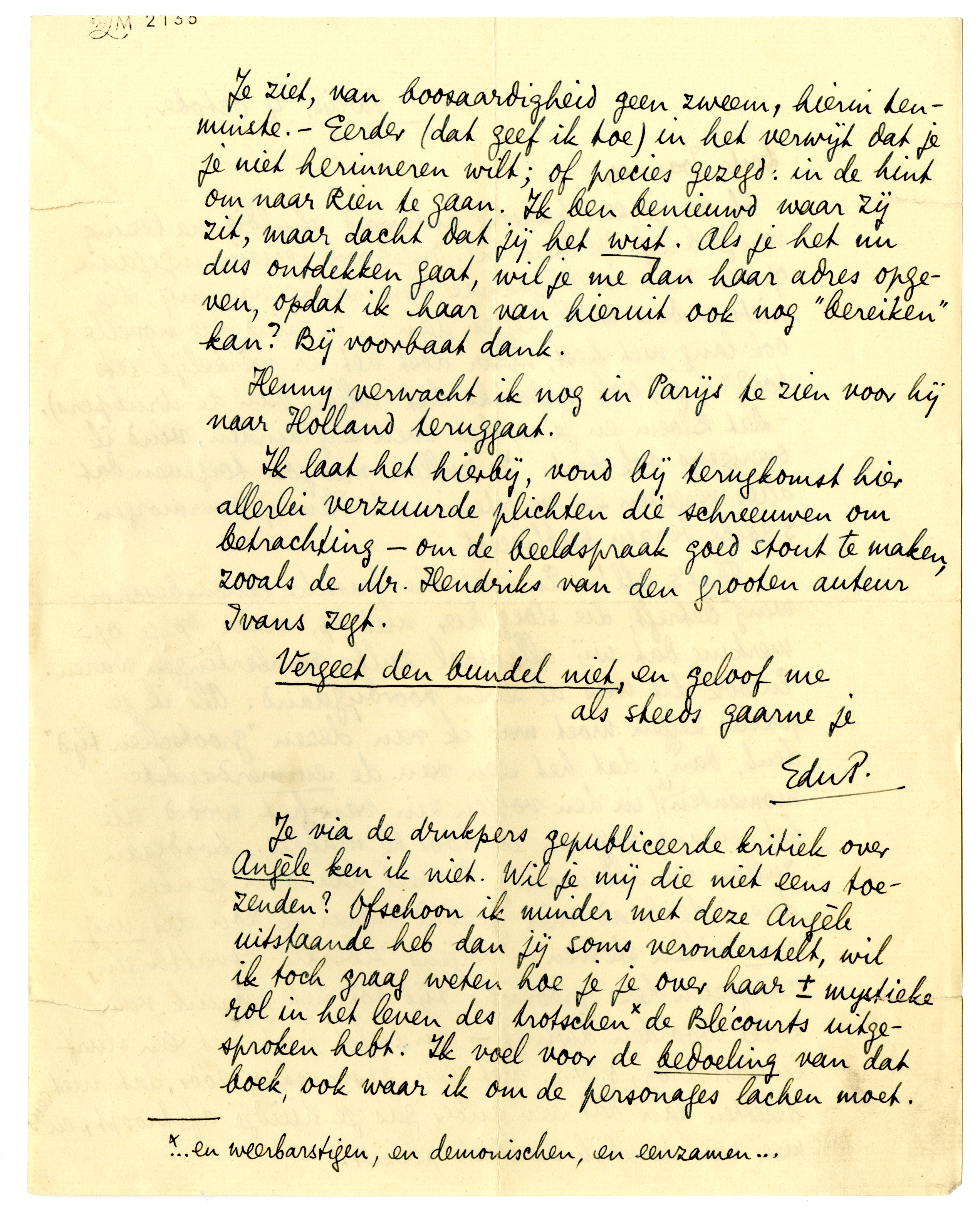 Je via de drukpers gepubliceerde kritiek over Angèle3350 ken ik niet. Wil je mij die niet eens toezenden? Ofschoon ik minder met deze Angèle uitstaande heb dan jij soms veronderstelt, wil ik toch graag weten hoe je je over haar ± mystieke rol in het leven des trotschen* de Blécourts uitgesproken hebt. Ik voel voor de bedoeling van dat boek, ook waar ik om de personages lachen moet.
