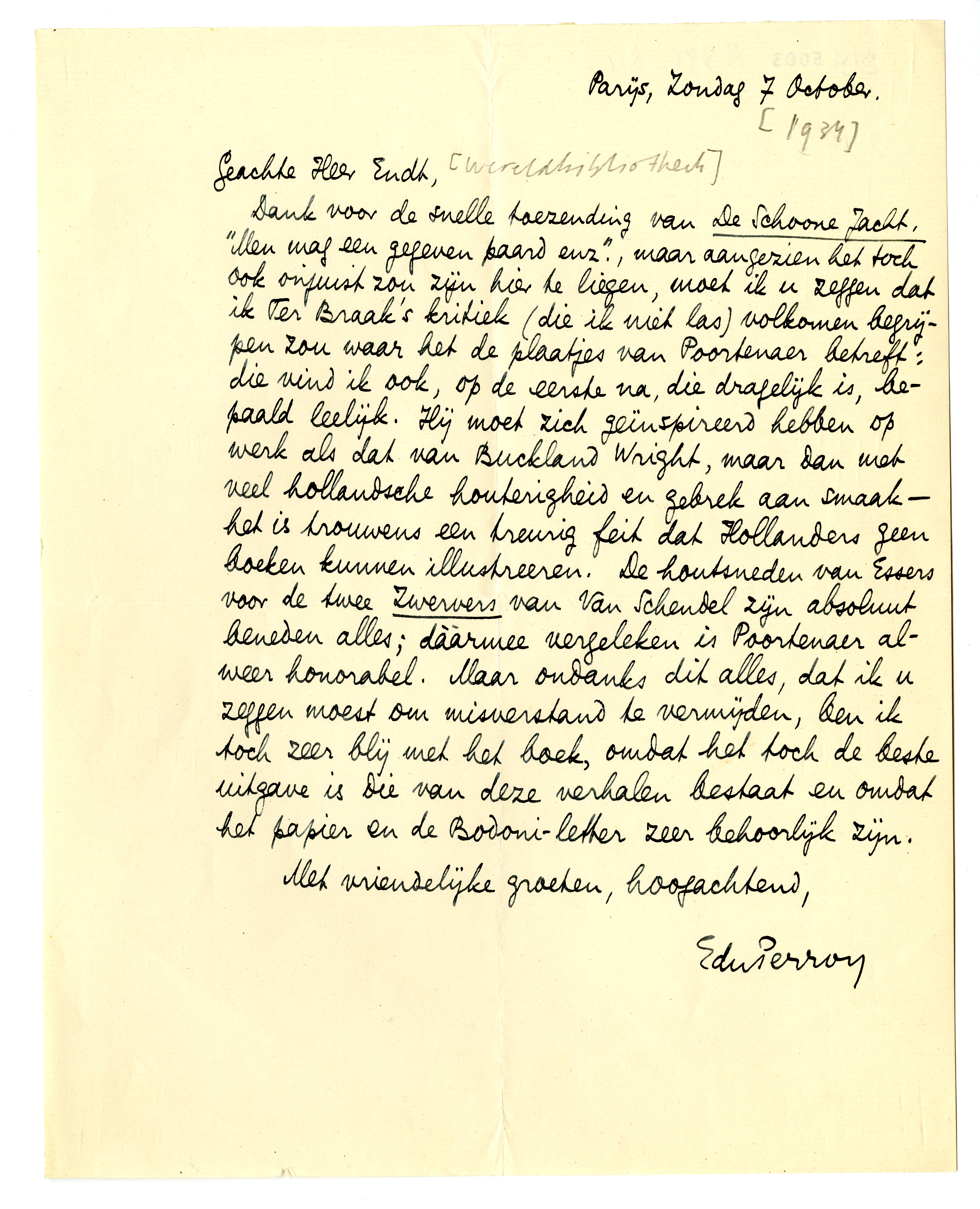 Dank voor de snelle toezending van De Schoone Jacht. ‘Men mag een gegeven paard enz.’, maar aangezien het toch ook onjuist zou zijn hier te liegen, moet ik u zeggen dat ik Ter Braak's kritiek (die ik niet las) volkomen begrijpen zou waar het de plaatjes van Poortenaer betreft: die vind ik ook, op de eerste na, die dragelijk is, bepaald leelijk. Hij moet zich geïnspireerd hebben op werk als dat van Buckland Wright, maar dan met veel hollandsche houterigheid en gebrek aan smaak - het is trouwens een treurig feit dat Hollanders geen boeken kunnen illustreeren. De houtsneden van Essers voor de twee Zwervers van Van Schendel zijn absoluut beneden alles; dààrmee vergeleken is Poortenaer alweer honorabel. Maar ondanks dit alles, dat ik u zeggen moest om misverstand te vermijden, ben ik toch zeer blij met het boek, omdat het toch de beste uitgave is die van deze verhalen bestaat en omdat het papier en de Bodoni-letter zeer behoorlijk zijn.