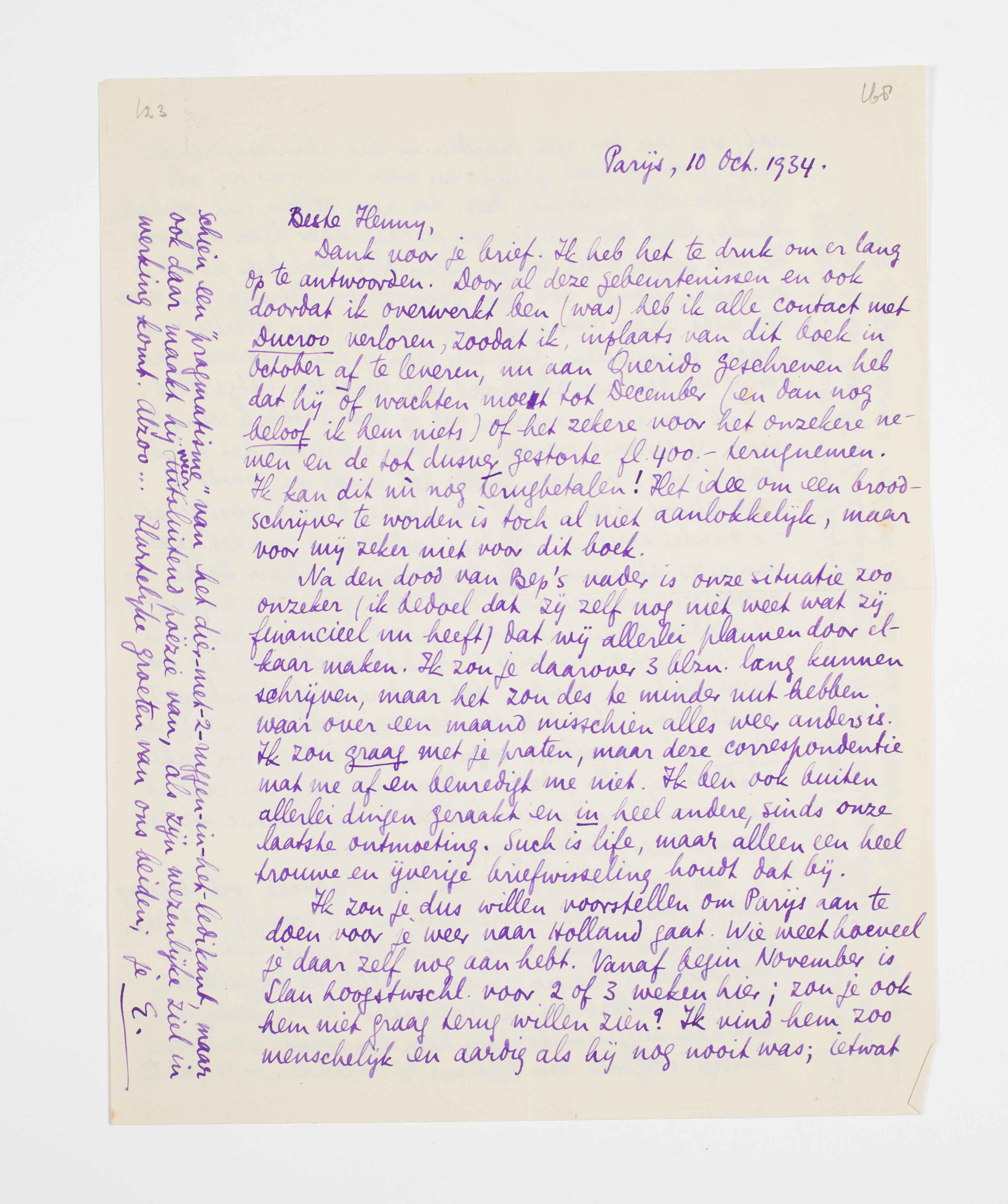 Dank voor je brief. Ik heb het te druk om er lang op te antwoorden. Door al deze gebeurtenissen en ook doordat ik overwerkt ben (was) heb ik alle contact met Ducroo verloren, zoodat ik, inplaats van dit boek in October af te leveren, nu aan Querido geschreven heb dat hij òf wachten moet tot December (en dan nog beloof ik hem niets) of het zekere voor het onzekere nemen en de tot dusver gestorte fl. 400.- terugnemen. Ik kan dit nù nog terugbetalen! Het idee om een broodschrijver te worden is toch al niet aanlokkelijk, maar voor mij zeker niet voor dit boek.